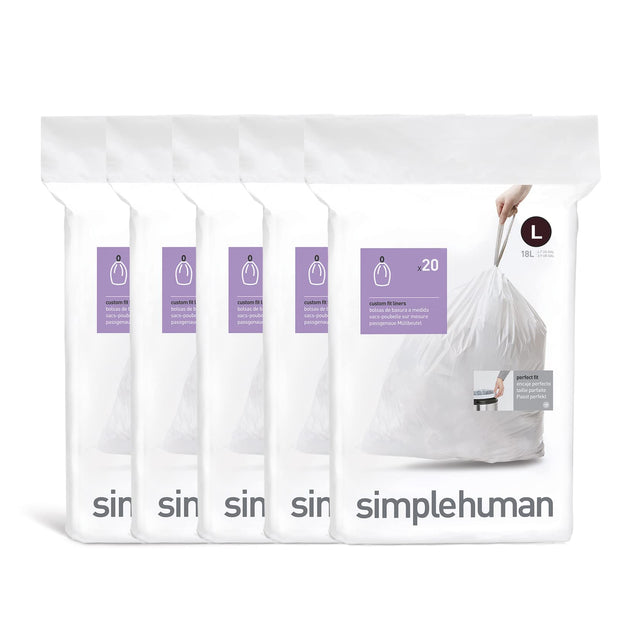 simplehuman Code L 100 Count, Dispenser Pack Custom Fit Liners, Drawstring Trash Bags, 18 Liter / 4.7 Gallon, White