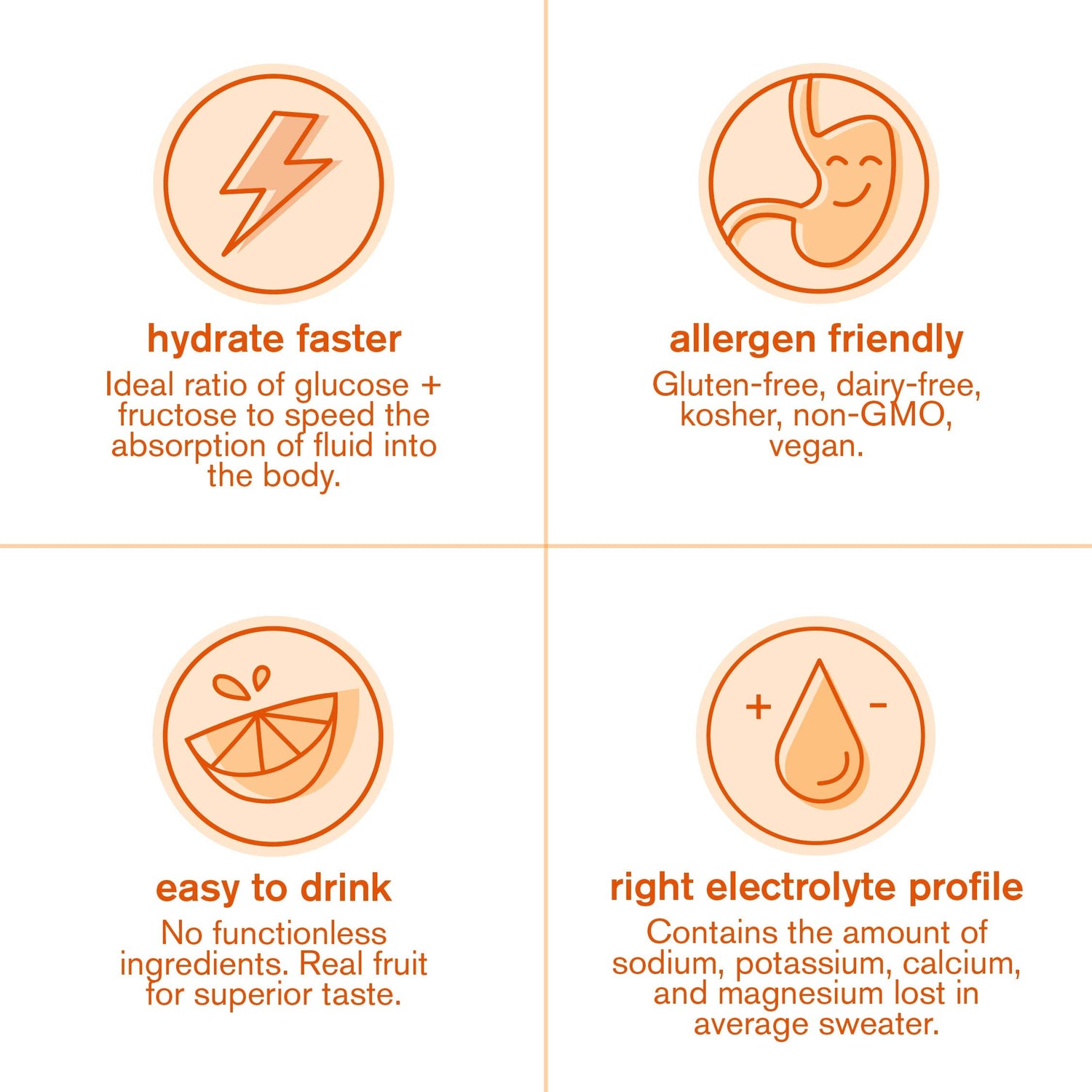 - Orange: Vegan, plant based, verified non-GMO, gluten free, dairy free and Kosher. Only real fruit used for flavor and a light, refreshing taste. 50% less sugar and nearly 2x the sodium of the leading sports drink*