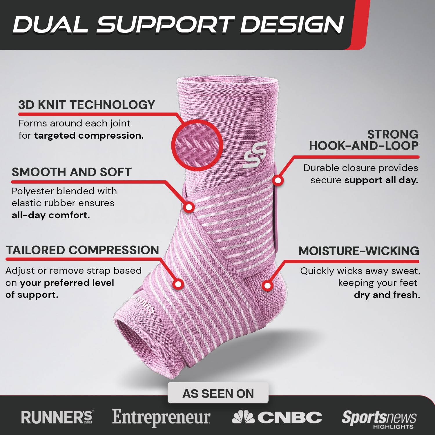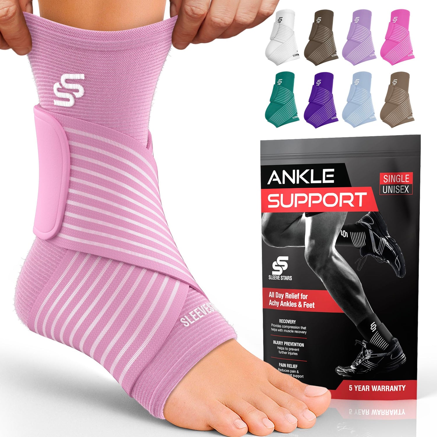 Sleeve Stars Ankle Brace for Women & Men, Ankle Wrap for Sprained Ankle, Compression Sleeve for Plantar Fasciitis Relief, Easy Customizable Support: w/Removable Strap (Single/S:9"-10"/Baby Pink)