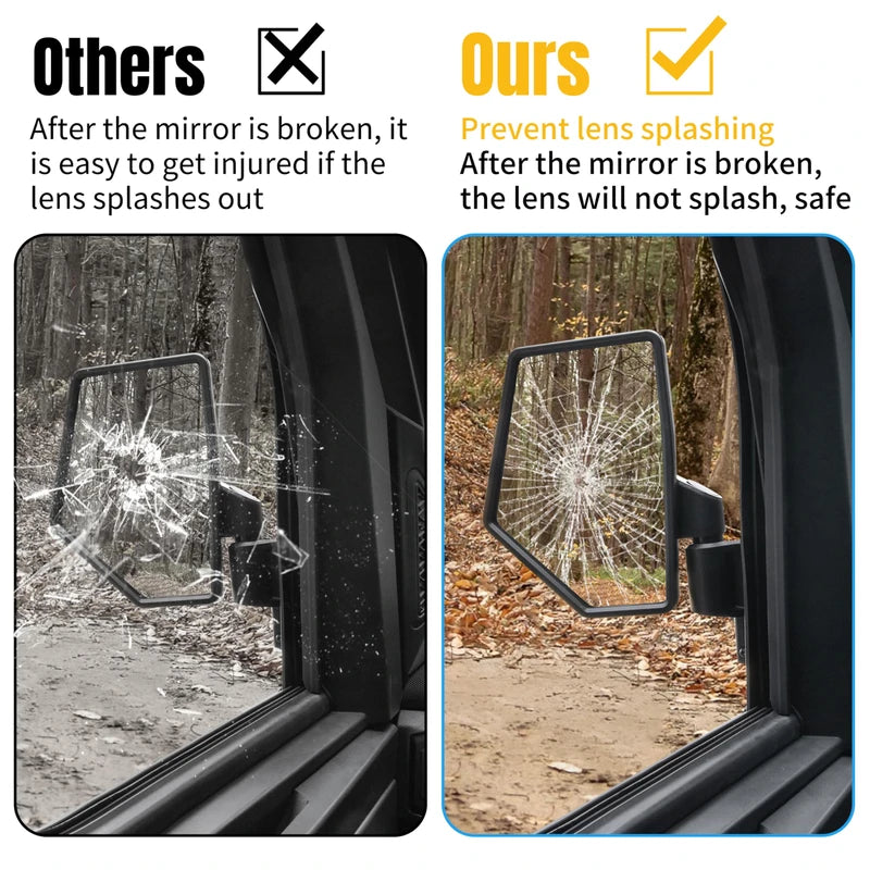 - Our side view mirrors are made of high impact ABS plastic housing and splash-proof tempered glass, offer a larger and clearer view behind you, our side mirrors can keep broken mirrors from splashing everywhere with splash-proof glass, provides higher safety for you