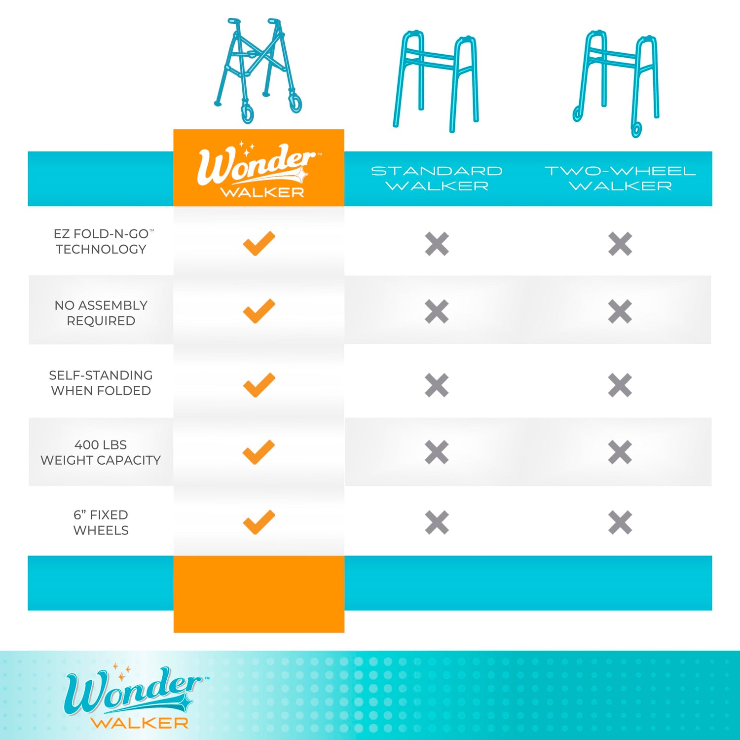 - Compact Folding Walker: The Wonder Walker is the world's most compact folding walker; the patented EZ Fold-N-Go technology allows it to fold 4 times smaller than the average walker into a 5 x 7 inch footprint to help save space while on the go