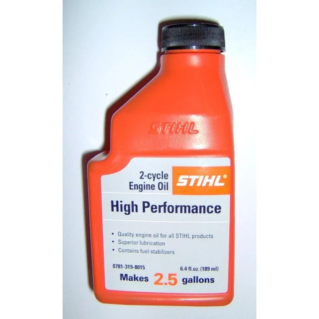 FOR SALE IS ONE (1) NEW BOTTLE OF HIGH PERFORMANCE 2 CYCLE ENGINE OIL 6.4 fluid ounce (makes 2.5 gallons) BY STIHL BRAND MPN 0781-319-8015 UPC# 795711145569. THIS ONE (1) ORANGE BOTTLE OF HIGH PERFORMANCE 2 CYCLE ENGINE OIL MAKES 2 1/2 GALLONS OF MIXED FUEL. STIHL HIGH PERFORMANCE TWO CYCLE ENGINE OIL IS A QUALITY ENGINE OIL FOR ALL STIHL PRODUCT, SPECIALLY SUITED FOR HIGH PERFORMANCE CHAINSAWS AND POWER TOOLS LIKE THE STIHL BR600 LEAF BLOWER. THIS GENUINE STIHL BRAND TWO CYCLE OIL PROVIDES SUPERIOR LUBRICATION AND CONTAINS FUEL STABILIZERS. THIS 6.4 fluid ounce ORANGE BOTTLE WILL MAKE A 2.5 GALLON MIX. STIHL RECOMMENDS A MIX OF 50:1 HIGH QUALITY 89 OCTANE OR HIGHER, UNLEADED (non ethanol) GASOLINE TO STIHL ENGINE OIL. THIS SAME MIX RATIO SHOULD BE USED DURING BREAK IN. YOU WILL RECEIVE ONE (1) BOTTLE OF GENUINE STIHL BRAND HIGH PERFORMANCE 2 CYCLE ENGINE OIL IN 6.4 fluid ounce ORANGE PLASTIC BOTTLE SHIPPED BY USPS FIRST CLASS MAIL.....