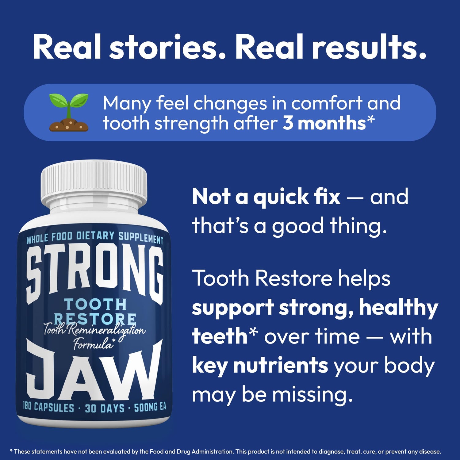 - CLEAN, TESTED, AND TRUSTED: Made in the USA and third-party tested for purity and potency, Strong Jaw Supplement Tooth Restore uses natural, high-quality ingredients with no GMOs or artificial fillers. This clean formula supports daily teeth and gum care and is ideal for adults seeking calcium supplements for women, vitamins for teeth and gums, or a trusted teeth health supplement, including strong jaw tooth restore, tooth supplements, and teeth remineralizing gum.