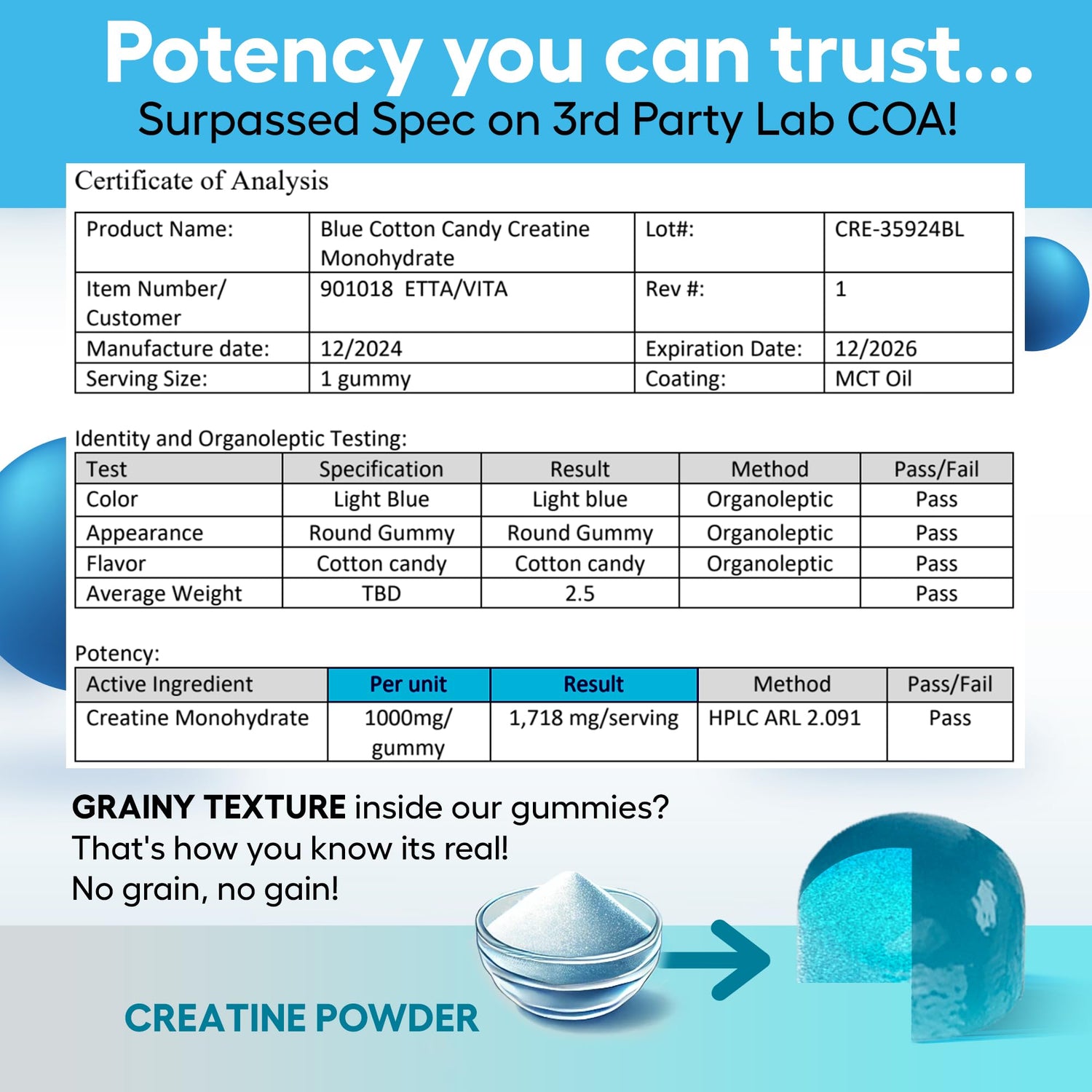- High-Quality Lab-Tested Ingredients - Our mono-hydrate gummies are manufactured, tested, and bottled in our GMP-certified facilities. Etta Vita is committed to the highest quality ingredients and manufacturing processes.