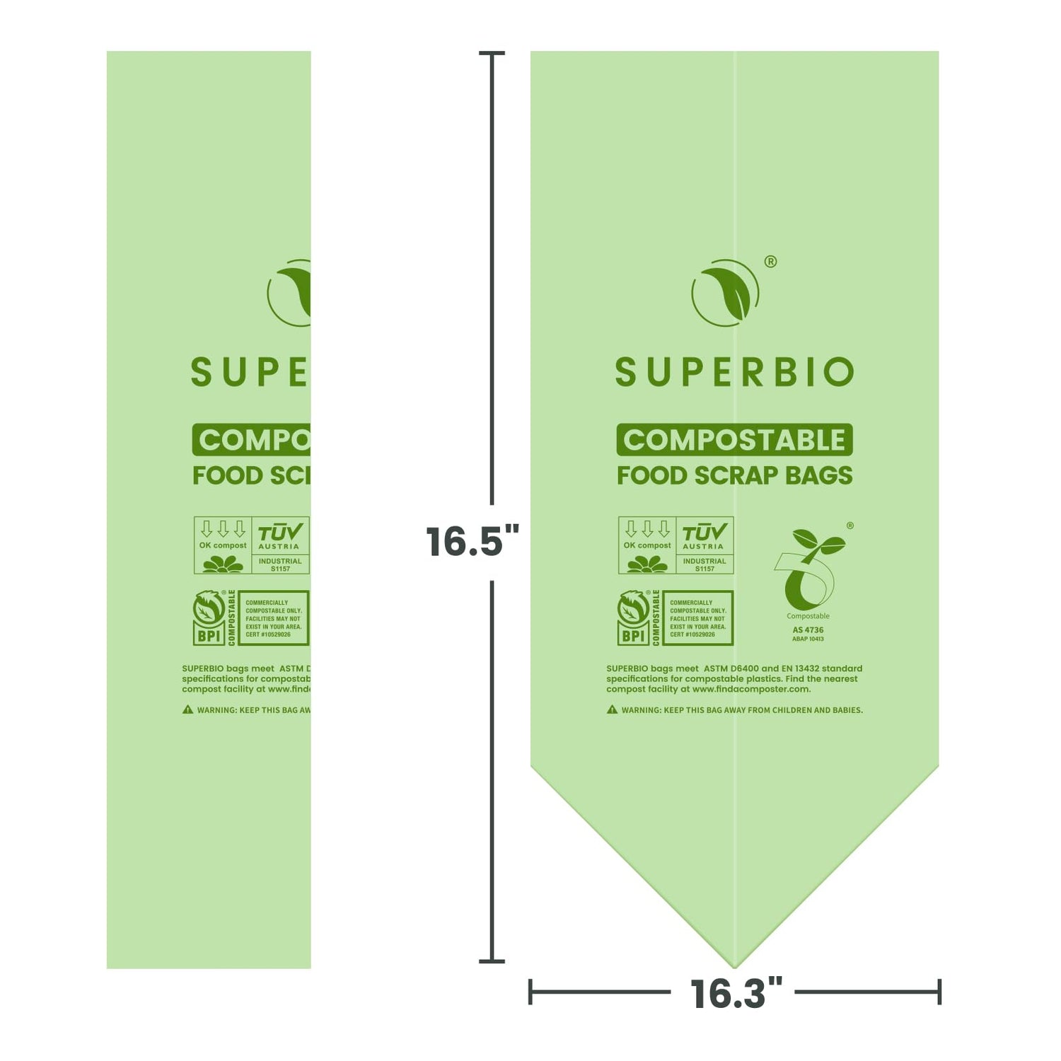 - Product Information: SUPERBIO compostable food scrap bags, 2.6 gallon (9.84 L) 16.3 in x 16.5 in x 0.67 mil, 100 bags per roll, flat top