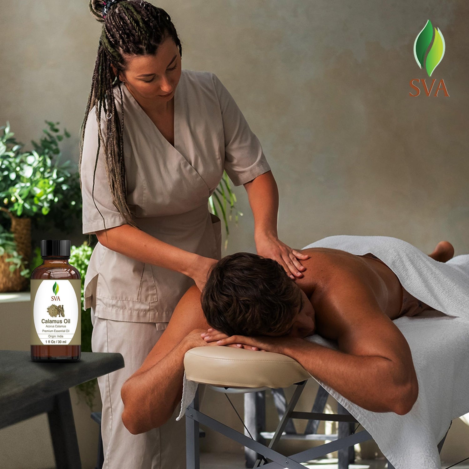 - Skin Nourishment: SVA Calamus Oil is suitable for massage. It should always be diluted with suitable carrier oil before use since it is highly concentrated. There are many ways to use Calamus essential oil for the skin. Add a few drops of the oil to your creams, lotions, or bath products to enjoy the goodness of Calamus oil for your skin