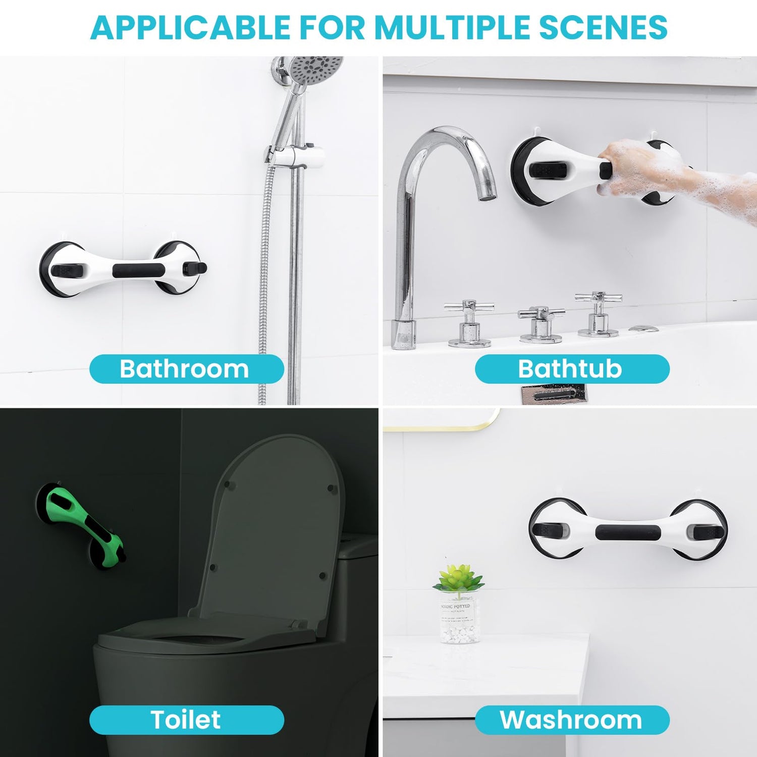 - Easy for Installation: Each suction cup shower handle equips 2 Strong suction cups with locking latches to provide stable protection. The bathtub hand rail ONLY needs to pull down the latches with 5 seconds and the installation is done, quickly and effortlessly! NO drilling, NO screws, NO glue and NO tools are required, fully removable, reusable and causing no damage to your wall