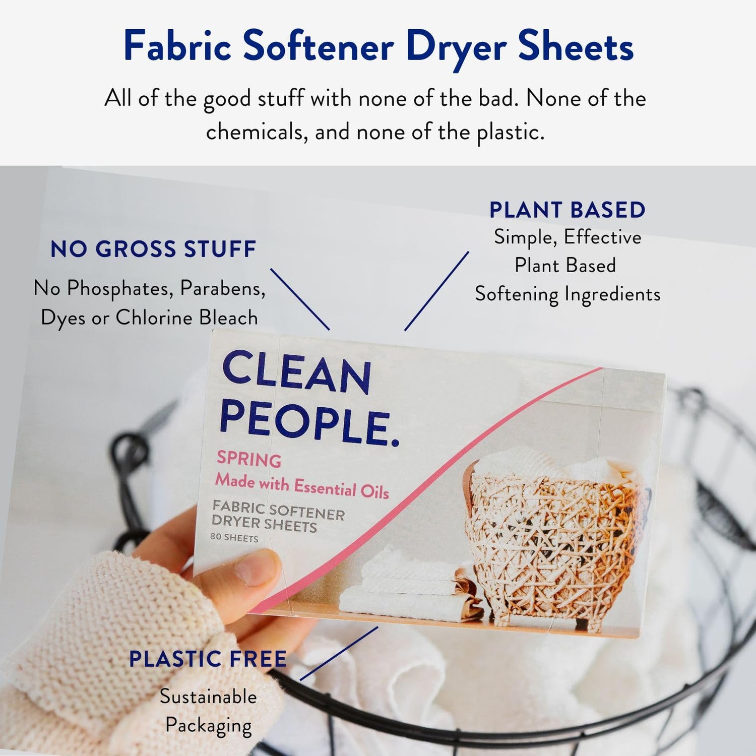 Details: Clean People Fabric Softener Dryer Sheets are all the good stuff in your favorite Dryer Sheets with none of the bad stuff (no animal fats, parabens, no phosphates, no added dyes, no chlorine). Did you know that most Dryer Sheets on the market use animal fats, synthetic fragrances, & synthetic fibers that end up in the landfill? How gross!