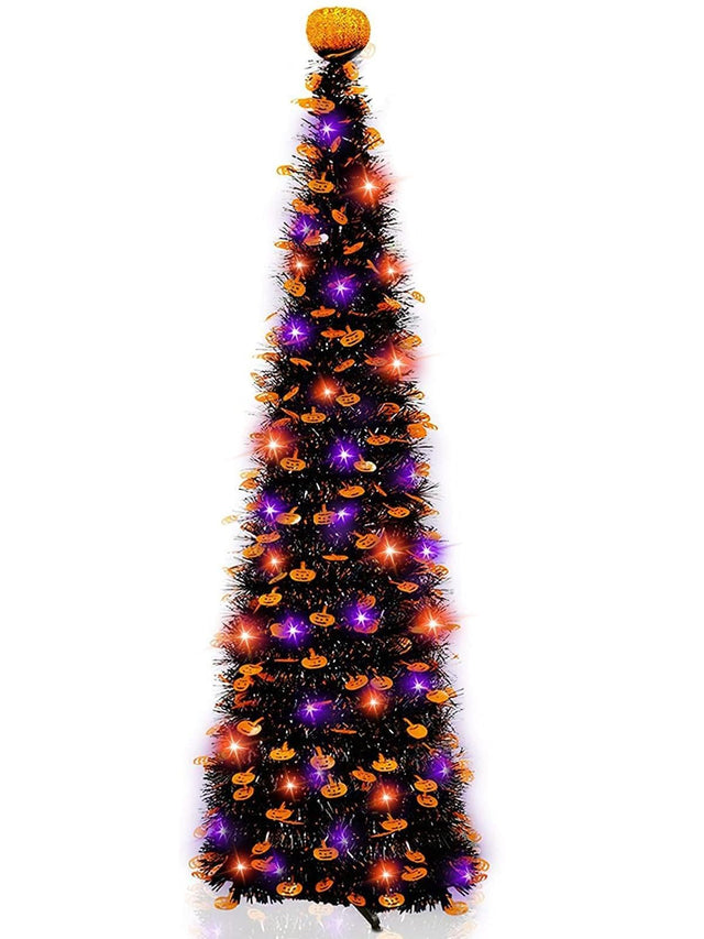 Timer - 6 Ft 60 LED Tinsel Halloween Tree Decor with Orange & Purple Lights 8 Modes Black Christmas Tree Pumpkin Battery Operated Pop Up Artificial Tree Indoor Outdoor Decorations
