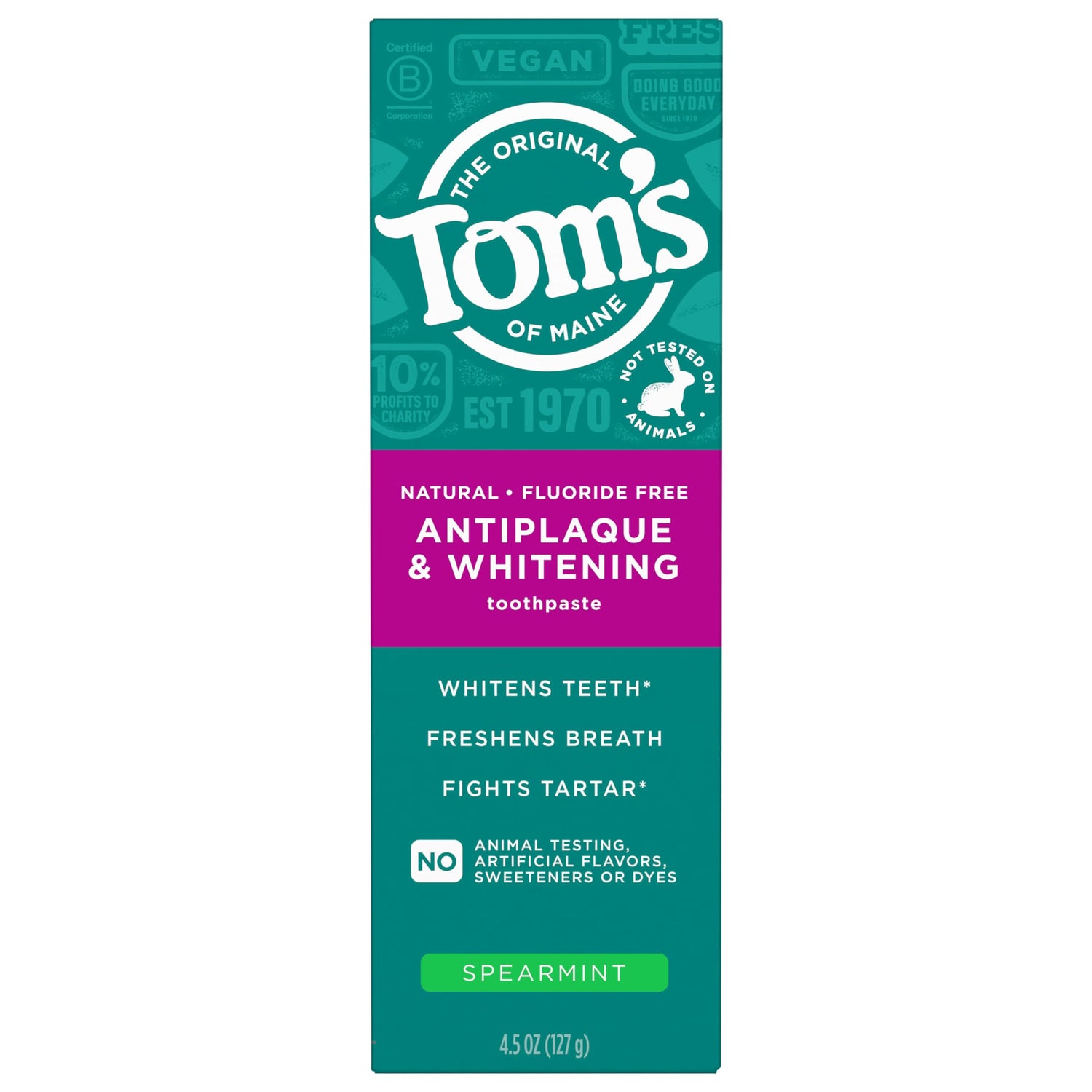 Details: Tom’s of Maine Antiplaque and Whitening Fluoride Free Toothpaste, Spearmint, 3-PACK Experience a bright smile using naturally derived and naturally sourced ingredients with the Tom’s of Maine Antiplaque and Whitening Fluoride Free Toothpaste. This 3-pack of fluoride free toothpaste comes in a refreshing Spearmint flavor and gently whitens your teeth by removing surface stains with regular brushing.