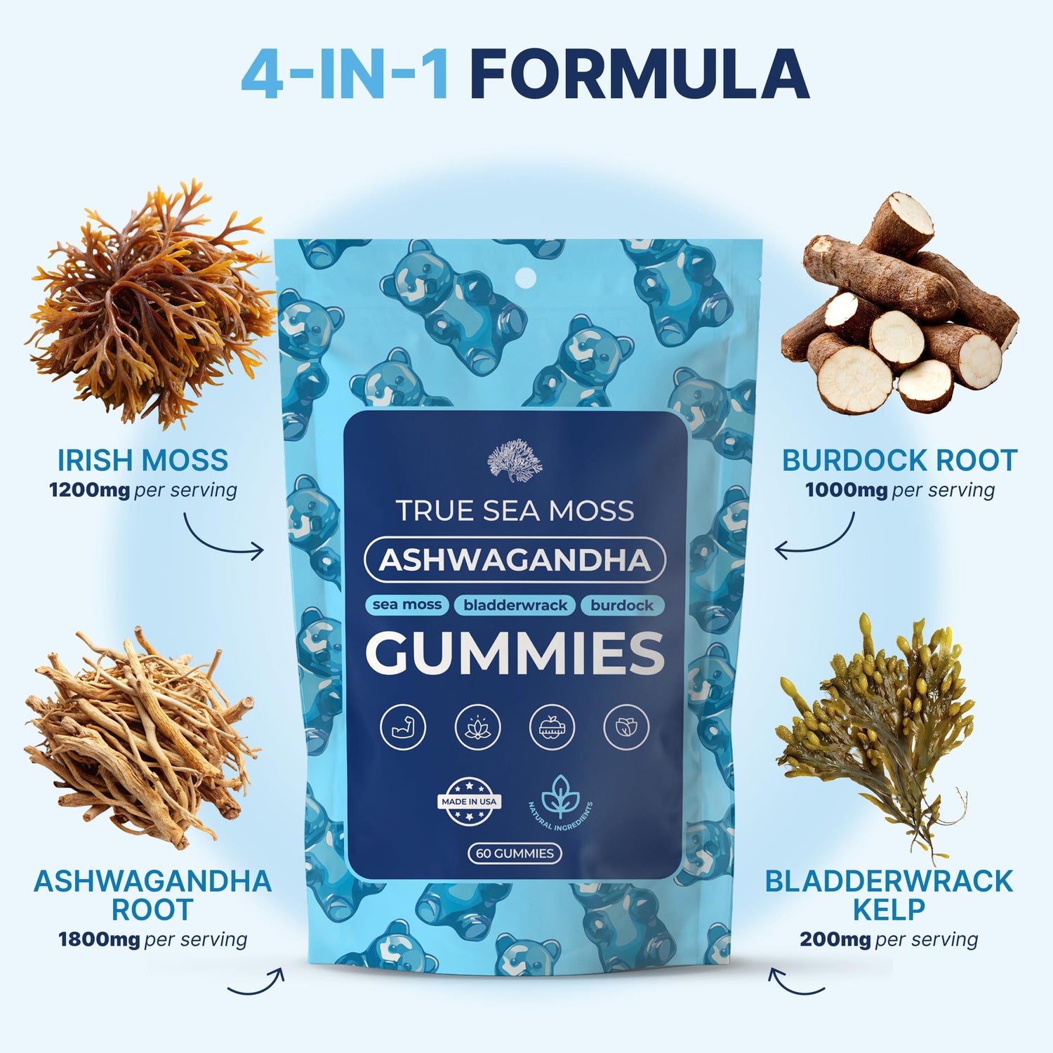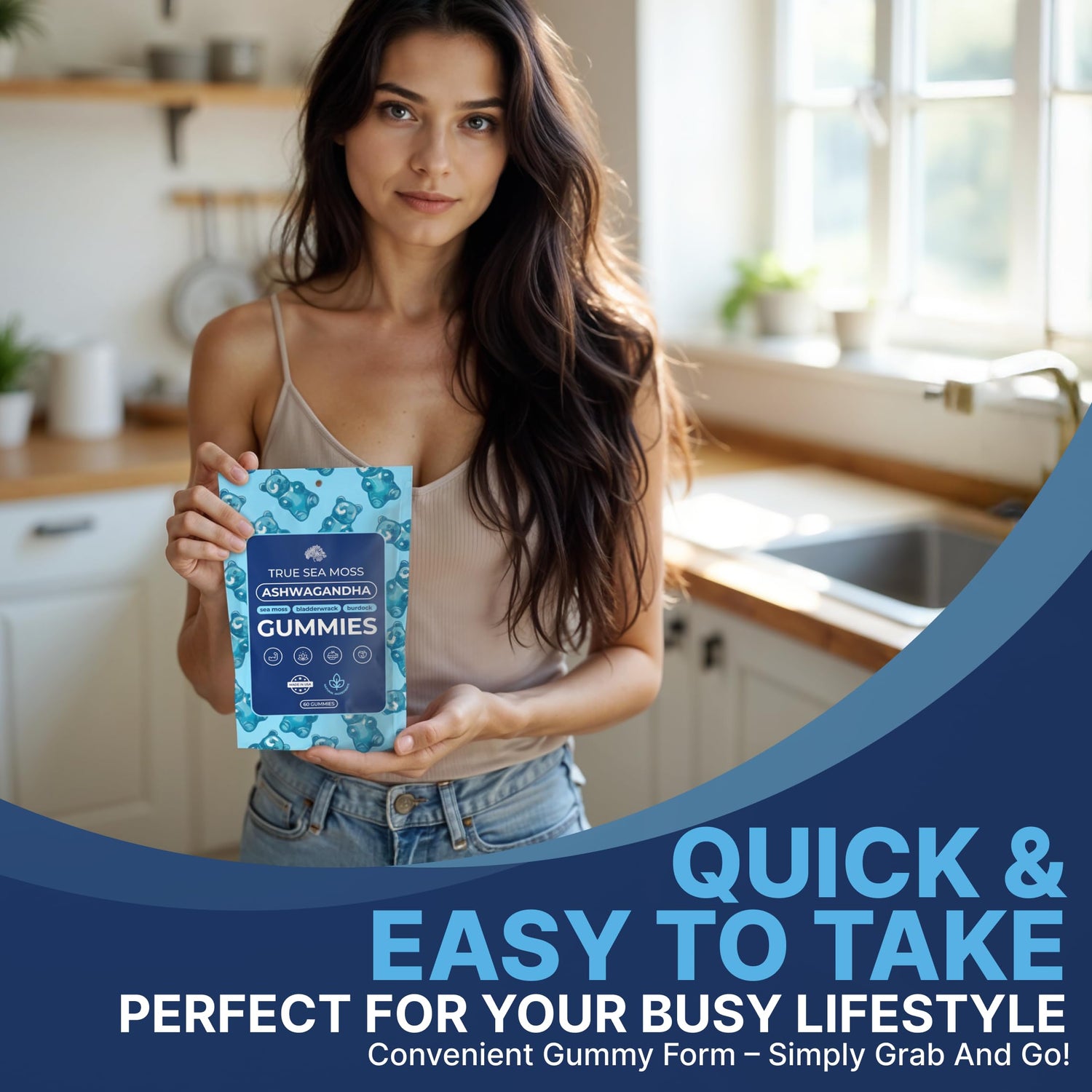 TrueSeaMoss Ashwagandha Gummies for Women & Men – Vegan Herbal Blend with Sea Moss, Bladderwrack & Burdock, 60 Gummies in Pouch (30-Day Supply)