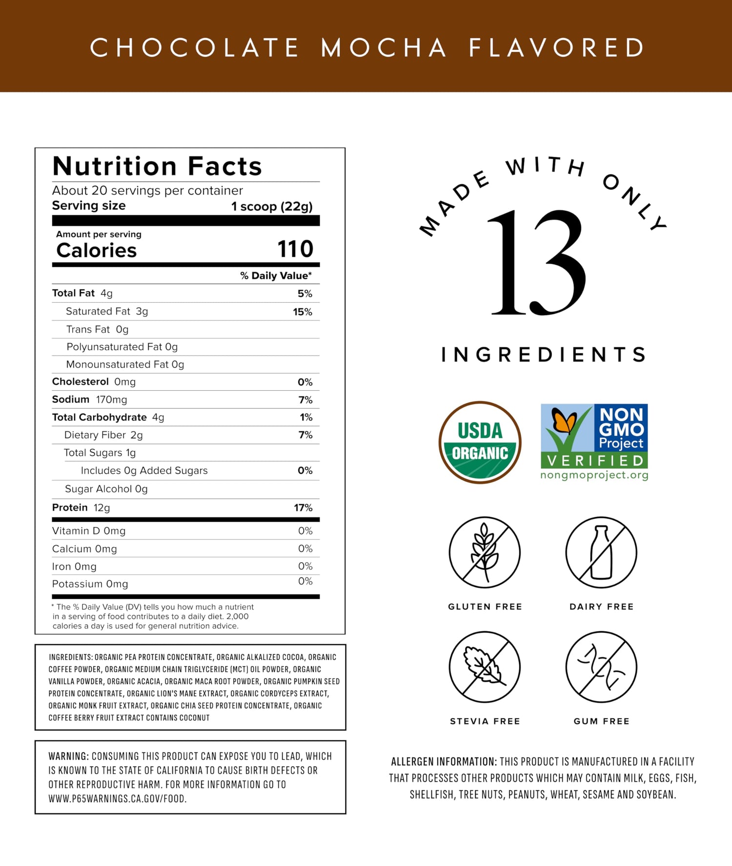 - Certified USDA Organic: Trust in the integrity of our plant-based vegan protein powder, certified USDA Organic, non-GMO, and vegan-friendly. Our straightforward label and simple ingredients ensure transparency and quality. Protein sourced from all organic pea, pumpkin seed, and chia seed.
