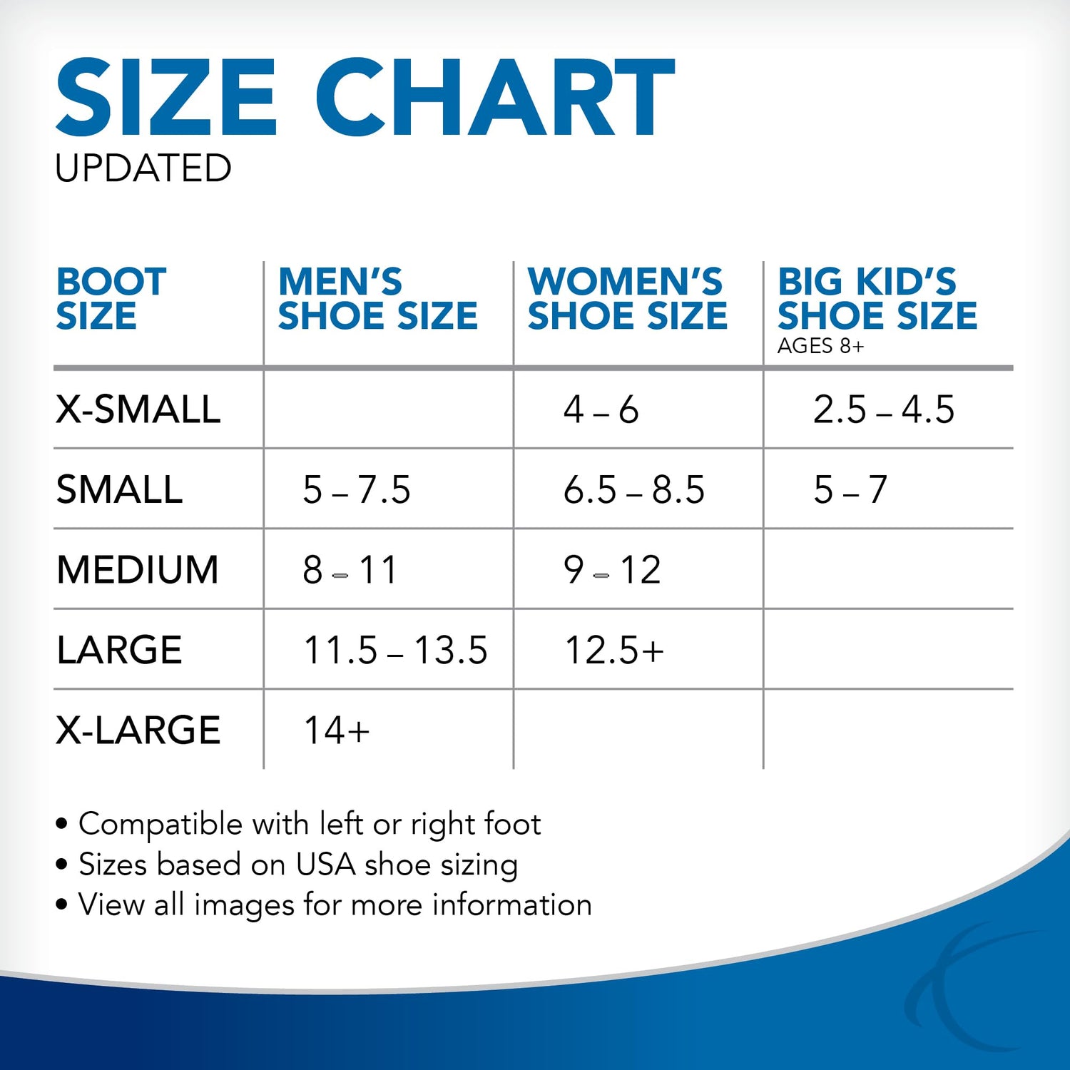 - BEFORE PURCHASING please view our newest sizing chart (second image). Size Extra Small fits Big Kids shoe sizes 2.5 -4.5 and Women’s shoe size 4-6. Size Extra Small weighs 1.8 pounds and can be worn on the left or right foot
