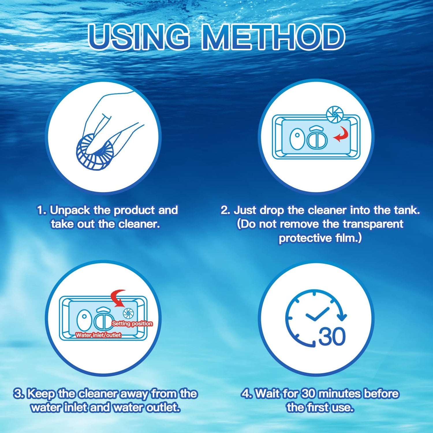 - HOW TO USE - DO NOT tear off the blue outer protective film, which is soluble in water tank directly. Please leave the toilet tank cleaner in the water tank for at least 1 hours to dissolve sufficiently until water gets blue before flushing.