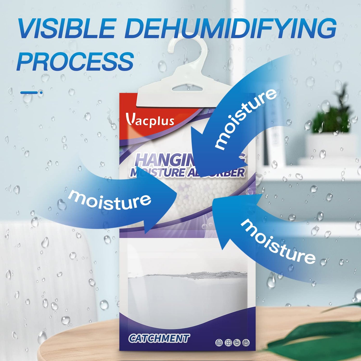 - EASY & SAFE: Vacplus moisture absorber packets provide an easy solution to protecting items and fabrics from excess moisture. By Hanging them up, physical dehumidification gives you a Safe, Green & Energy-saving life.