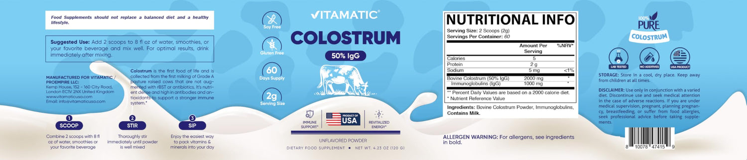 Vitamatic Bovine Colostrum Powder - 50% Highest IgG - Supplement for Gut Health, Hair Growth, Beauty, Muscle Recovery, & Immune Support - Easy to Mix - Unflavored - 60 Servings
