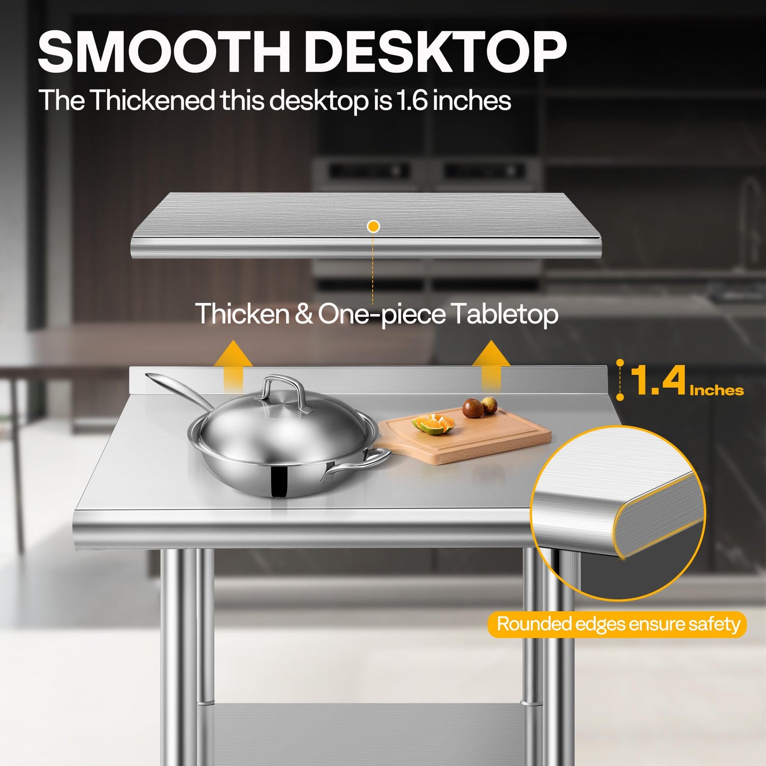 - THICKENED & ONE-PIECE TABLETOP - This table top is 42 mm (1.6 inches) thick, and adopts one-piece molding technology, which is strong and not easy to dent and deform; The desktop can hold up to 330 lbs; The rounded edge prevents you from hitting the table corners to ensure safety when working; There is a 1.4-inch high backsplash on the backside to prevent items from slipping off the work table; The surface is very smooth, which is easy to clean and maintain