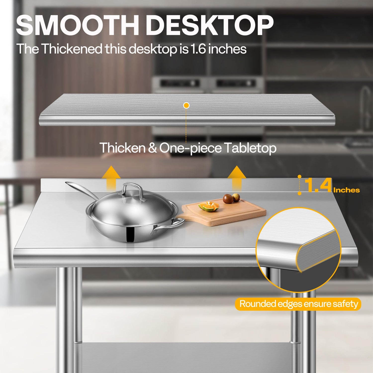 - THICKENED & ONE-PIECE TABLETOP - This table top is 42 mm (1.6 inches) thick, and adopts one-piece molding technology, which is strong and not easy to dent and deform; The desktop can hold up to 330 lbs; The rounded edge prevents you from hitting the table corners to ensure safety when working; There is a 1.4-inch high backsplash on the backside to prevent items from slipping off the work table; The surface is very smooth, which is easy to clean and maintain
