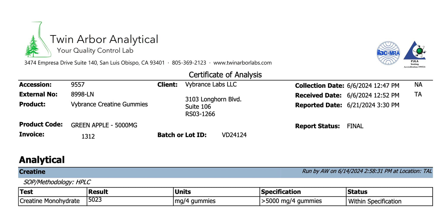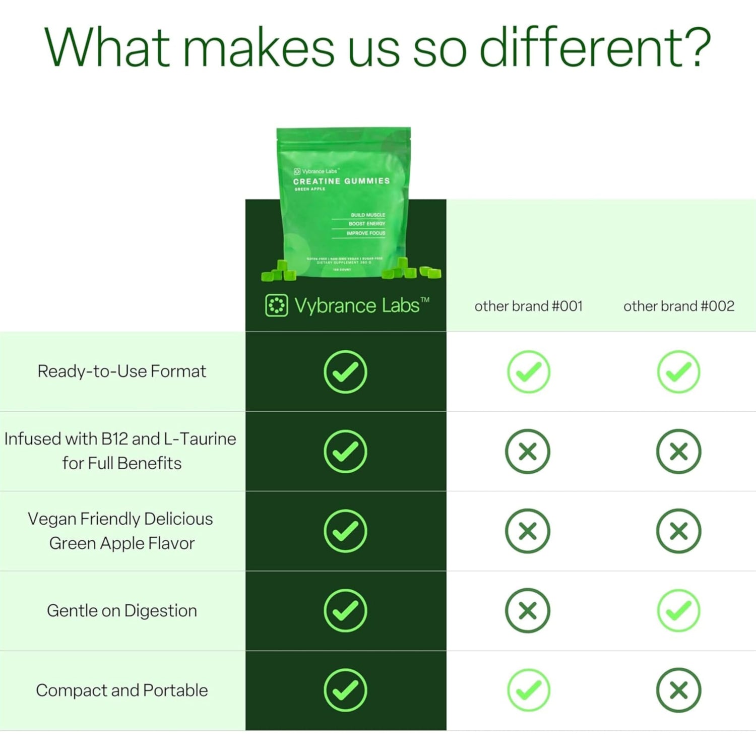 VYBRANCE LABS Creatine Monohydrate Gummies for Women & Men - 5g Creatine with Taurine & B12 for Energy, Muscle & Focus | Vegan, Sugar Free, Gluten-Free | Creatine Monohydrate | 120 ct Green Apple