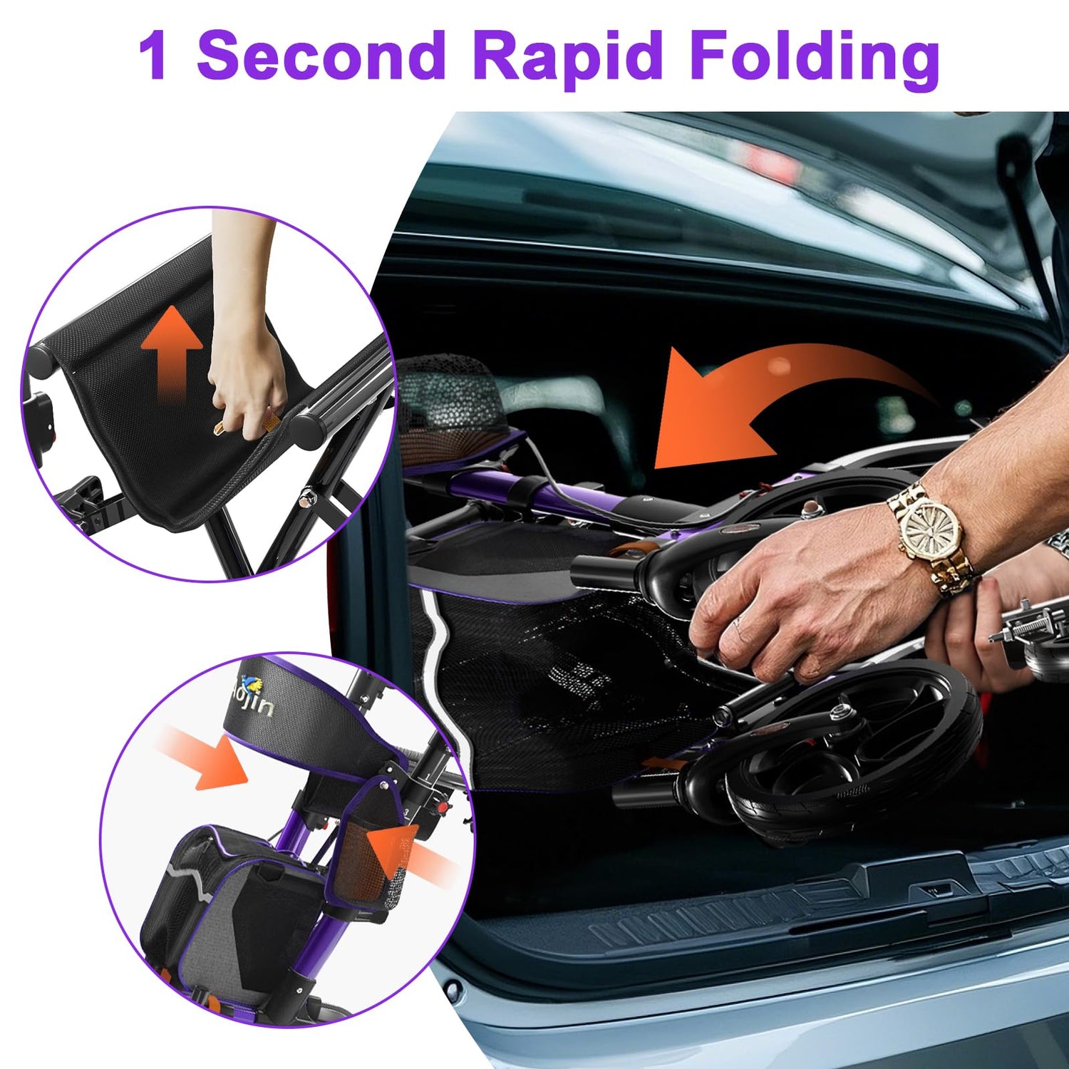 - 【Convenient Folding Walker with Shopping Bag】Our rollator walker with seat folds up in just 1 second and weighs only 16.5 lbs, making it easy to transport and store. The roomy storage bag keeps your hands free and makes outings more convenient, with all your essentials right where you need them.