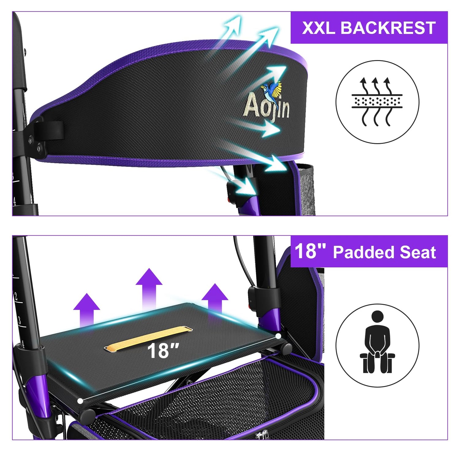 Walkers for Seniors, Rollator Walker with Seat, 350 lb Weight Capacity, 18" Big Seat, 8" All-Terrain Wheels, 6-Level Adjustable Height, Lightweight Aluminum Frame Rollator Walkers for Seniors (Purple)