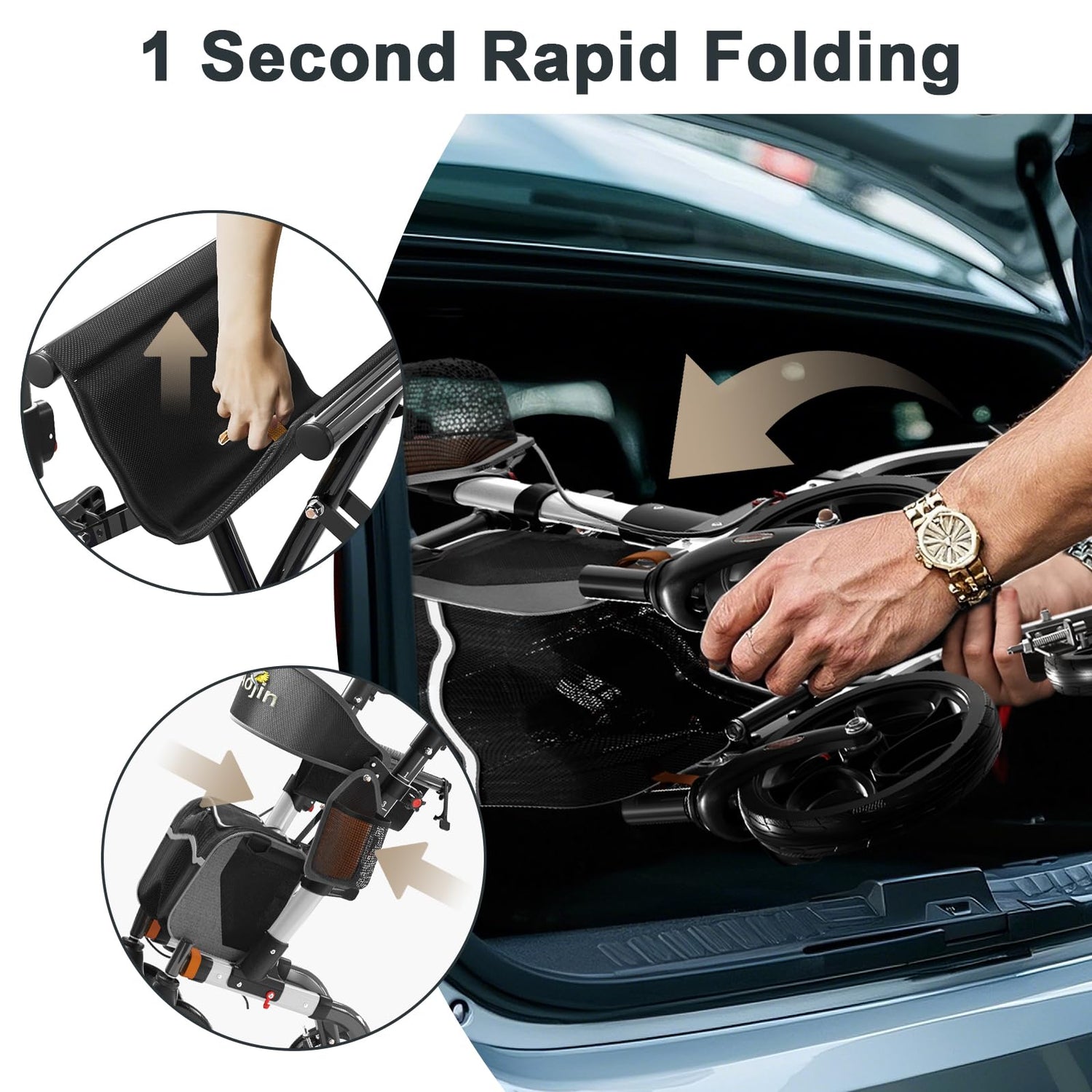 - 【Convenient Folding Walker with Shopping Bag】Our rollator walker with seat folds up in just 1 second and weighs only 16.5 lbs, making it easy to transport and store. The roomy storage bag keeps your hands free and makes outings more convenient, with all your essentials right where you need them.