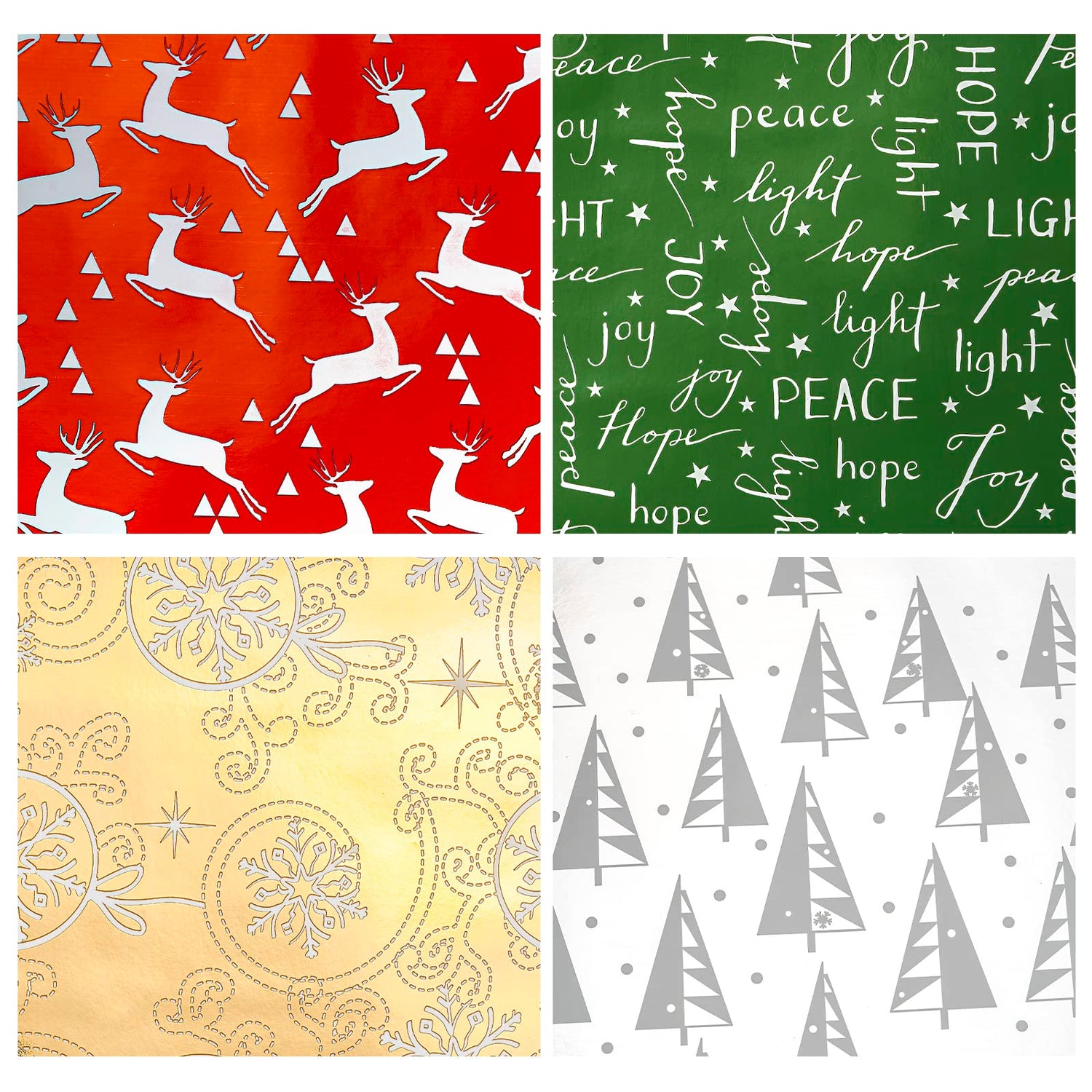 - Metallic Shine: White reindeer on red, "Joy Peace Hope" Xmas wish lettering on green, christmas ornaments on gold, white christmas trees and polka dots on silver, 4 different christmas designs with foil-accented winter and holiday icons.