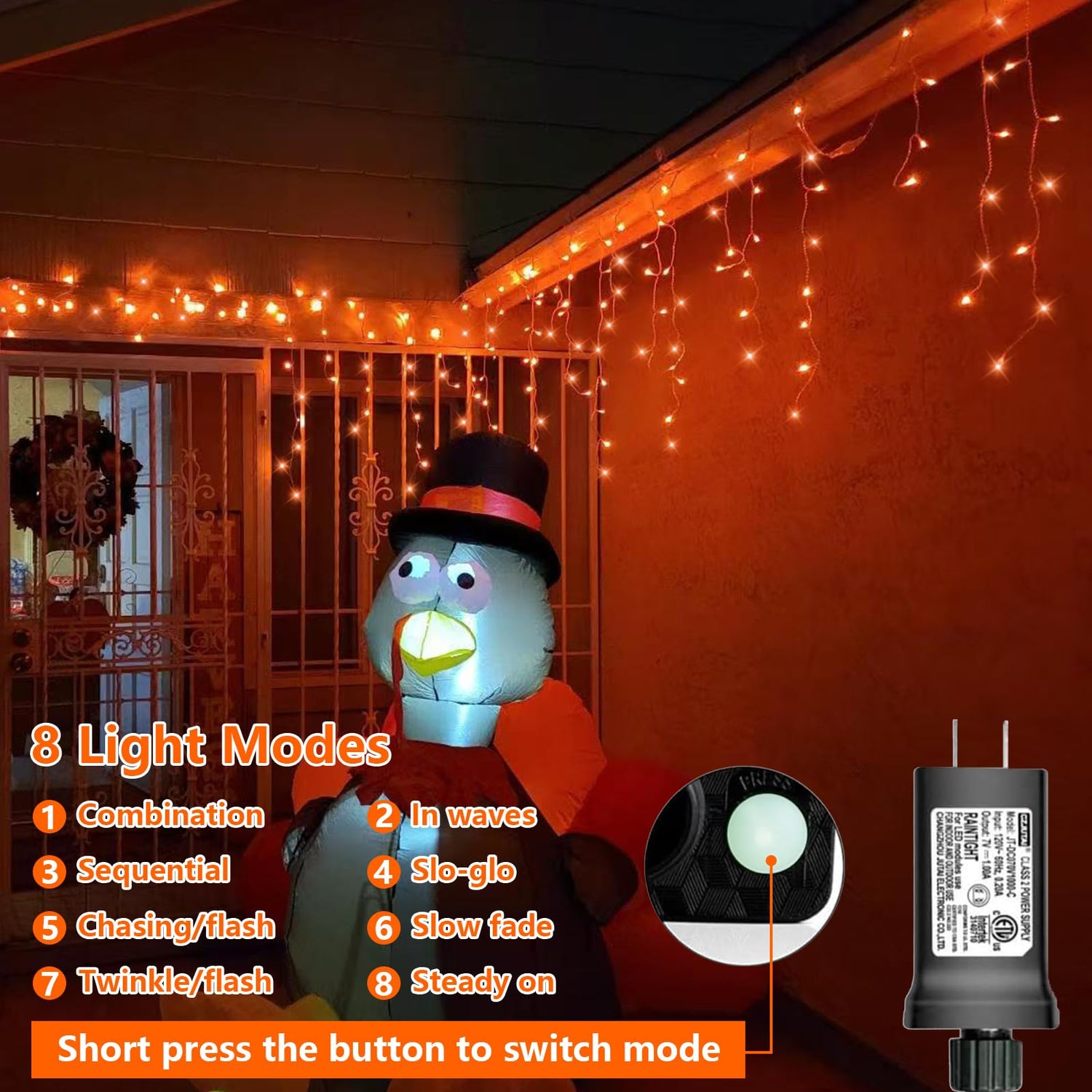- 8 Lighting Modes: Orange Icicle lights has 8 lighting modes (combination, in wave, sequential, slo-glo, chase/flash, slow fade, twinkle/flash, steady on). Different lighting effects are controlled by the adapter button. Change the mode as needed to attract and surprise your neighbors! Orange Icicle lights will be the best decoration for creating a terrifying atmosphere during Halloween.