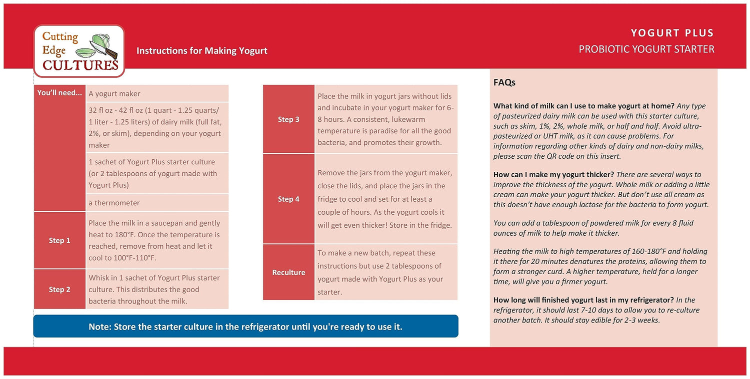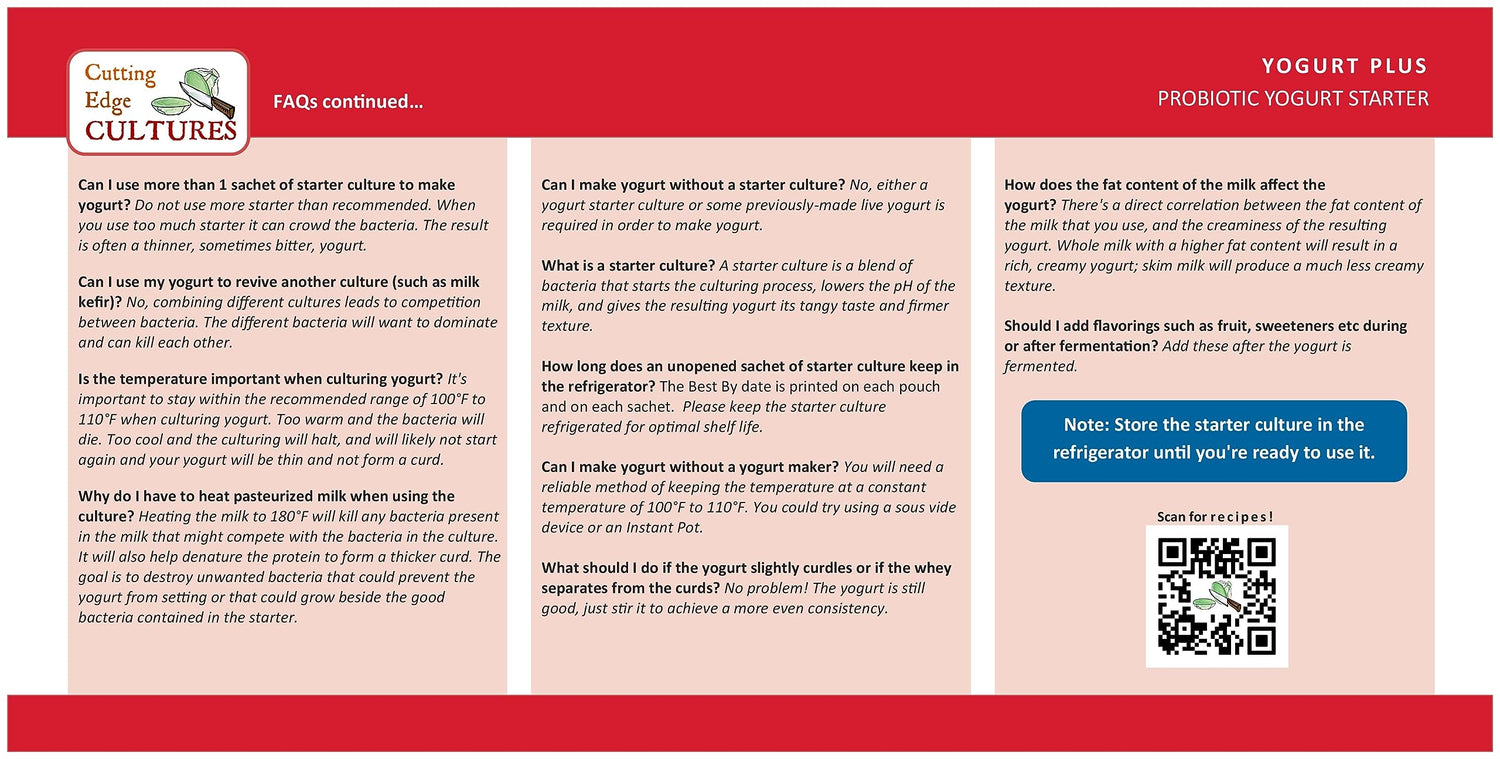 Details: Yogurt Plus Probiotic Yogurt Starter Culture By Cutting Edge Cultures 4 gram total size You can make up to 40 Quarts of yogurt with this pack by reculturing! Contains 4 Packets. Each packet makes 1.25 Quarts of yogurt which can be recultured up to 7 times! Contains Live Probiotics! Dairy-Free. non-GMO. VEGAN. Quick and Easy instructions included. Making your own yogurt gives you full control over the ingredients and ensures that your healthy homemade version has no added sugars or artificial flavors. When made with a premium-quality starter culture like Yogurt Plus your live probiotic yogurt can also contain many more probiotics than the store-bought versions. Our Yogurt Plus starter culture is made with a unique blend of 5 beneficial species, and has been carefully formulated to help modulate the gut microbiome: S.thermophilus, L. delbrueckii, L .plantarum, L. reuteri, B. longum Be Inspired-Make your own PROBIOTIC SUPERFOOD. Made in USA