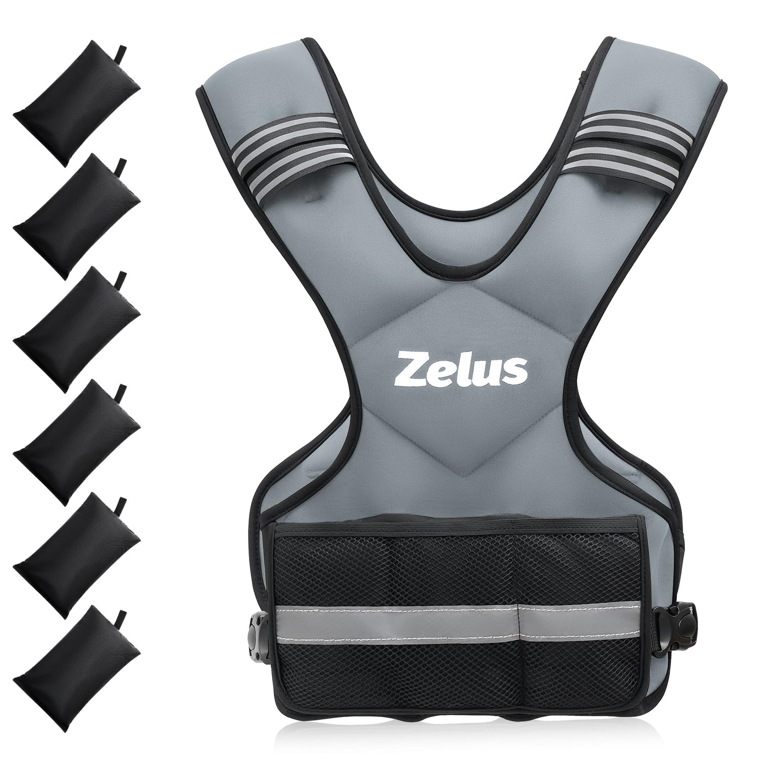 - Adjustable Weight Vest: This one-size-fits-most vest by Zelus weighs 20 lb. on its own and can reach up to 32 lb. with 6 included 2 lb. iron sand weight bags, offering adjustable resistance to enhance your core strength and endurance during any workout