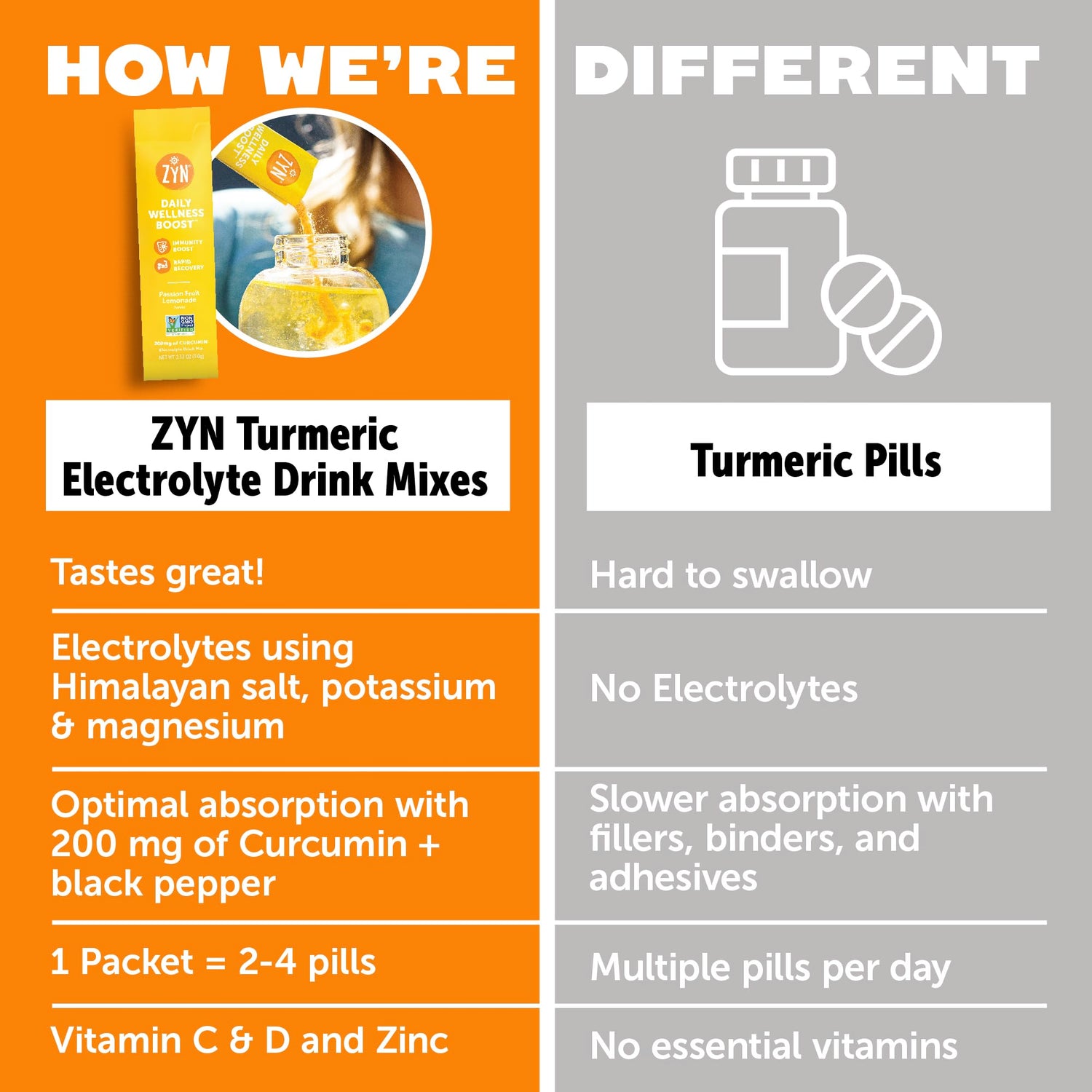 - 200mg of Curcumin from Turmeric: Every drink mix contains 200mg of Curcumin from Turmeric and Piperine (black pepper) to optimize absorption. Feel the benefits throughout your body. ZYN electrolyte powder mixes offer a multitude of health benefits for your gut, muscles, joint and overall well-being.
