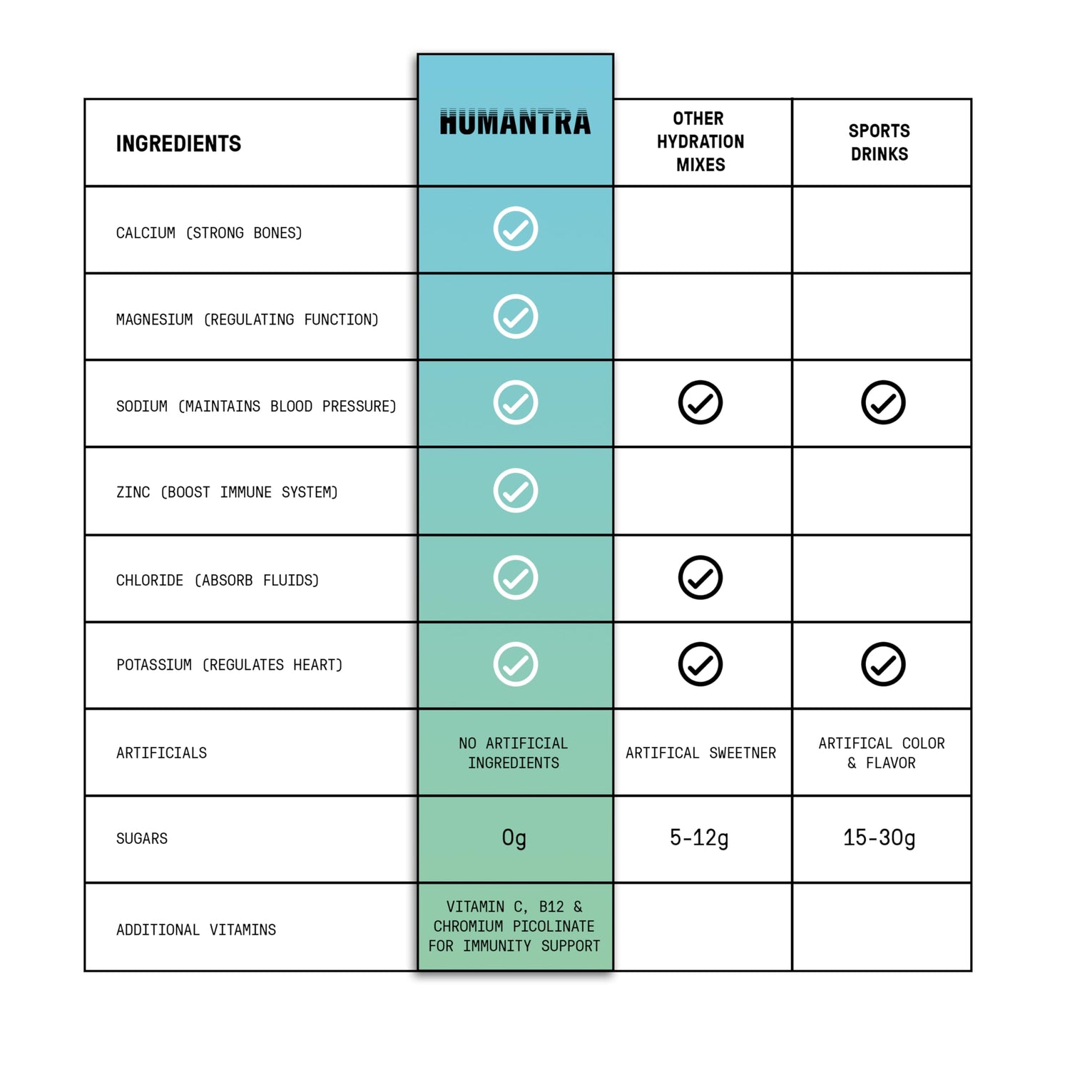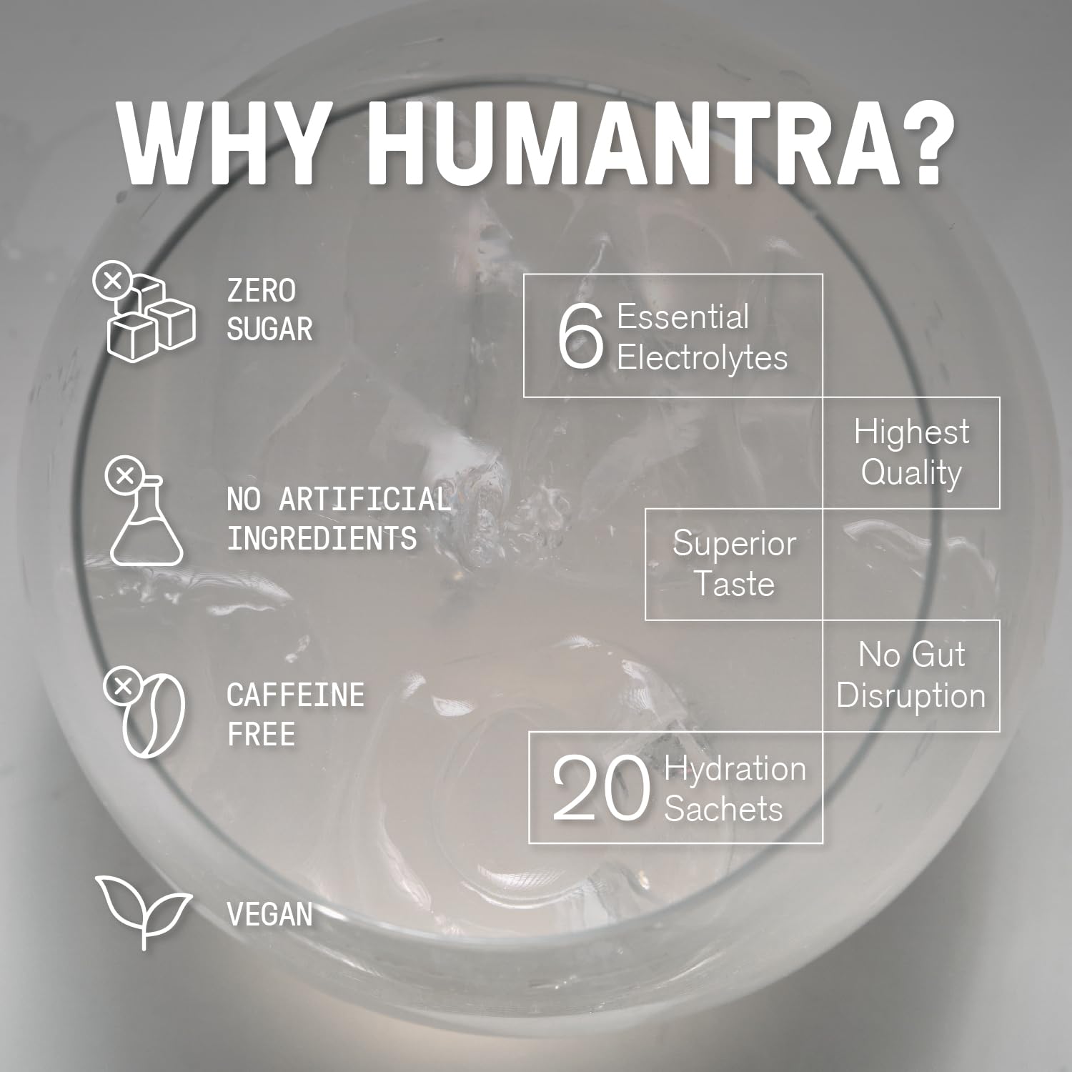 • The Humantra Difference - Keeping your body properly hydrated is one of the most important things you can do for your health. After realizing that most electrolyte formulas are loaded with sugar and gut-disrupting artificial ingredients, and only contain a few of the 6 essential electrolytes, we set out to create a best-in-class electrolyte powder that also tastes amazing.