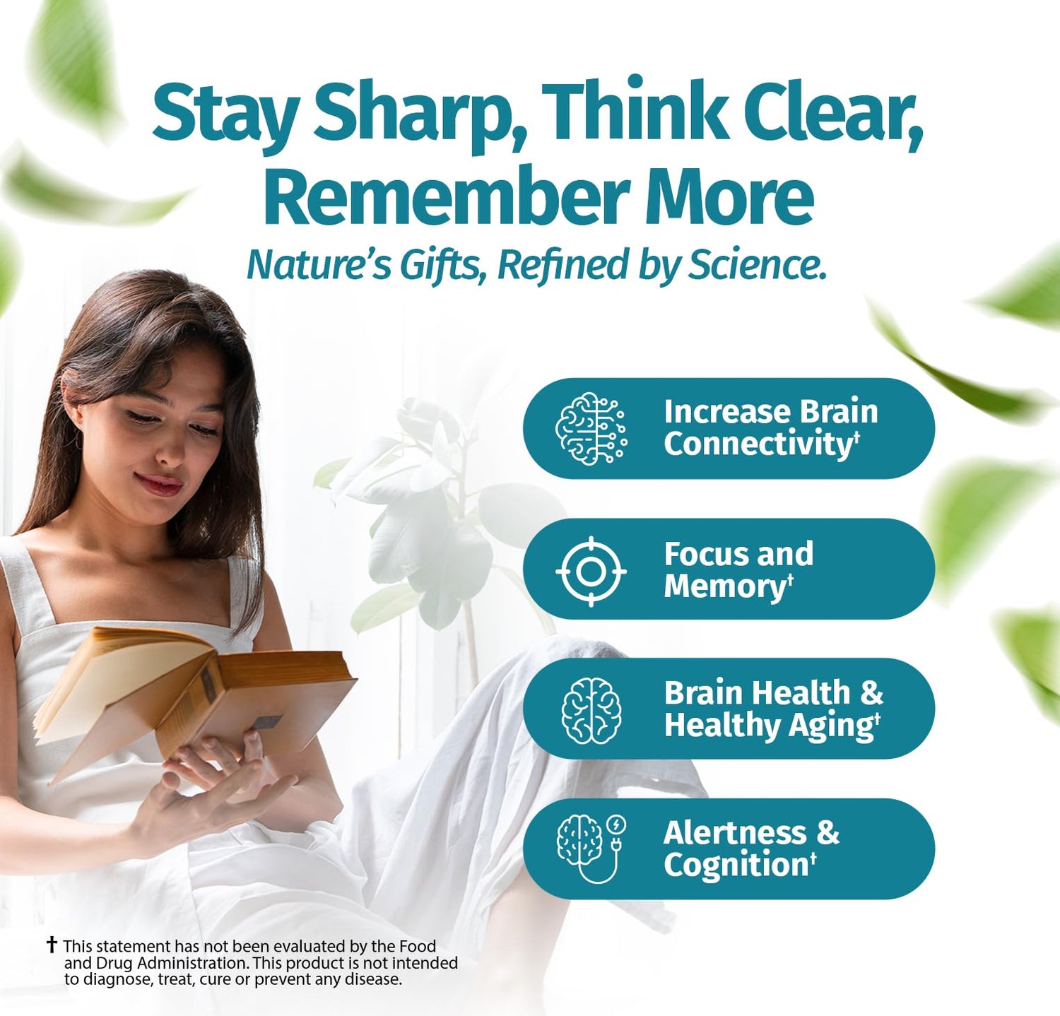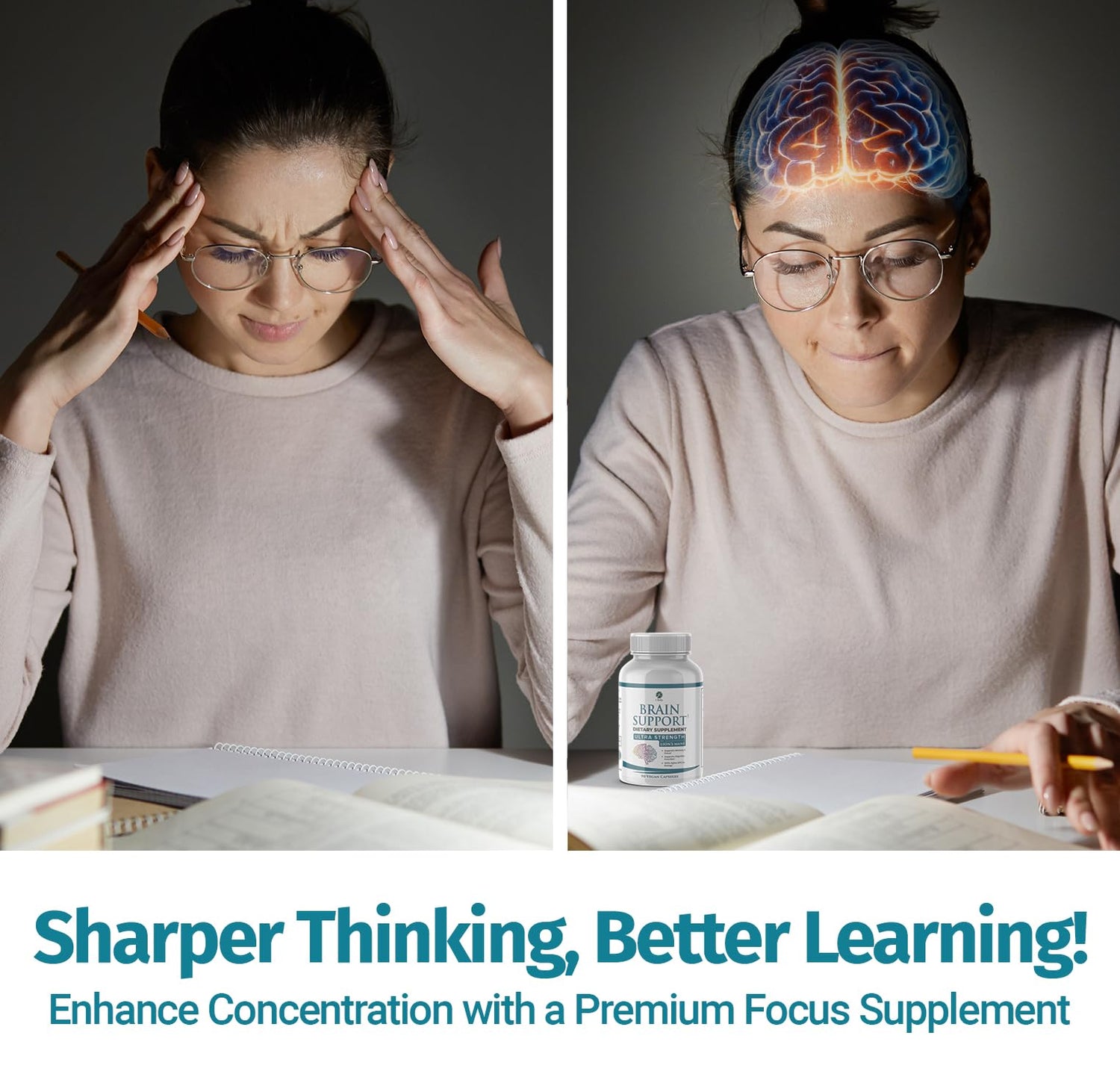 - Focus & Mental Clarity: Daily brain booster supplement that promotes sustained concentration and clear thinking; ideal for work, study, or creative tasks