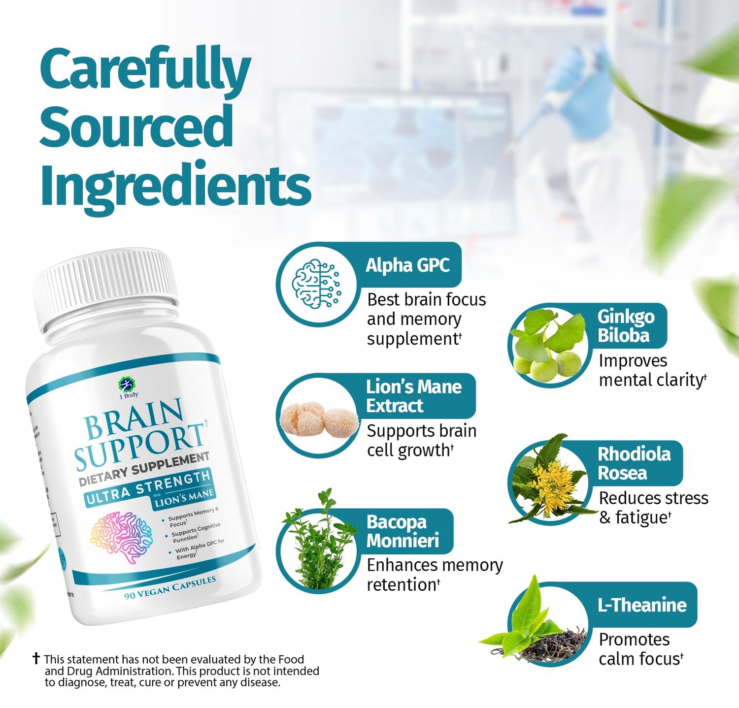 1 Body Brain Supplement – Nootropic Brain Booster with Alpha GPC, Ginkgo & Bacopa – 90 Vegan Capsules – Memory Supplement for Brain Support, Focus Pills, Brain Fog Supplements for Women and Seniors
