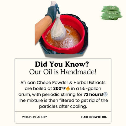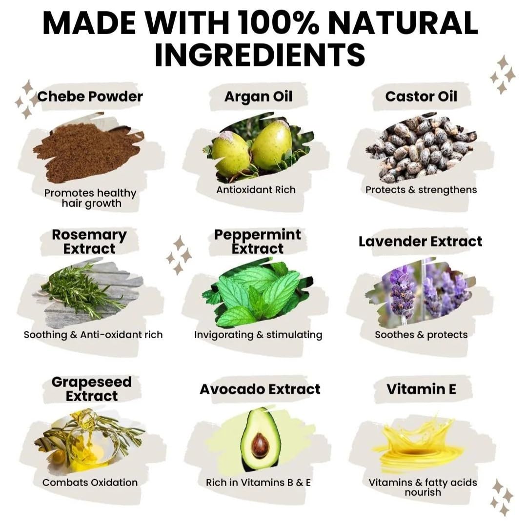 Details: Get thick, healthy hair with our 10 in 1 Hair Growth Oil with Raw African Chebe Powder. Our formula was designed to accelerate hair growth, replace lost hair, and drastically reduce hair loss, keeping your comb hair-free. Women and men have trusted this oil and seen amazing results. Beyond a product, it's a revolutionary hair growth method.