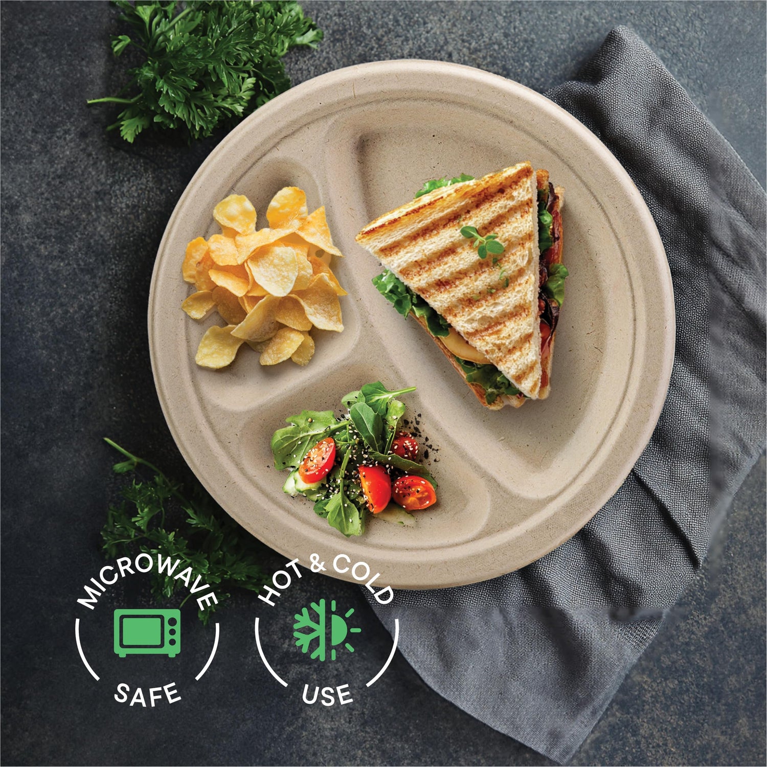 100% Compostable, 3 Compartment, Disposable Paper Plates [125-Pack] - {PFAS Free} - {BPA Certified} - [9 Inch] Heavy Duty Biodegradable Bagasse Sectional Lunch Trays + Dividers - Divided Platte Tray