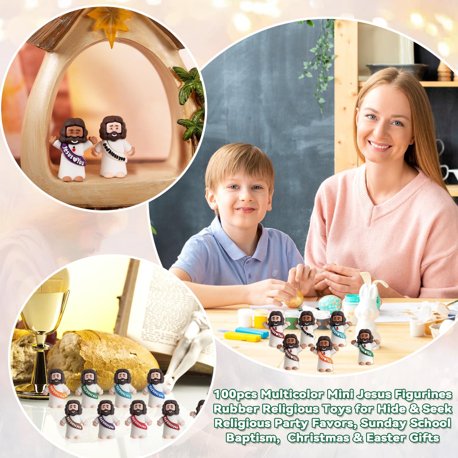 100pcs Little Jesus Figures in Bulk, Multicolor Mini Jesus Figurines Rubber Toys to Hide and Seek for Religious Party Favors , Sunday School Baptism, Christmas, Easter Egg Gifts for Kids, Man, Woman