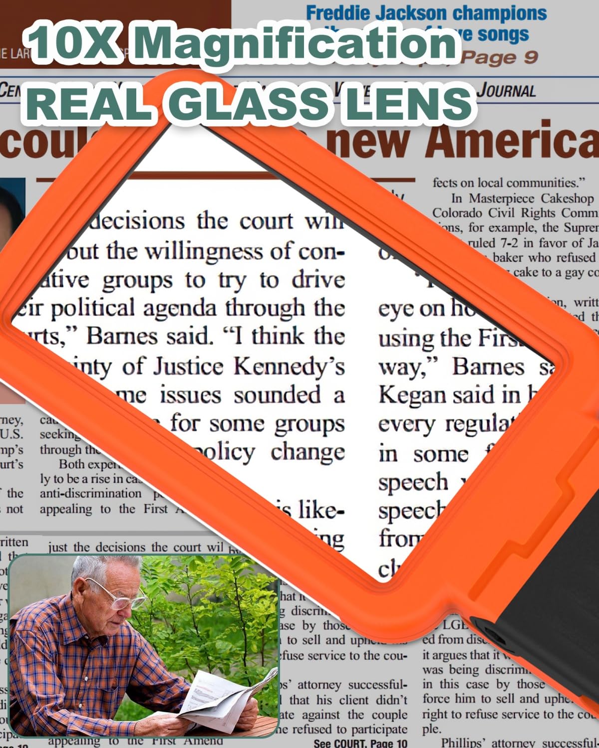 - 10X Rectangular Glass Lens: Unlike traditional round lenses that can distort edges, our 10x handheld magnifying glass uses a high quality rectangular glass lens, ensuring a clear and accurate view without unwanted distortion, perfect for reading small print, magazines, photos, jewellery and crafts of all kinds.