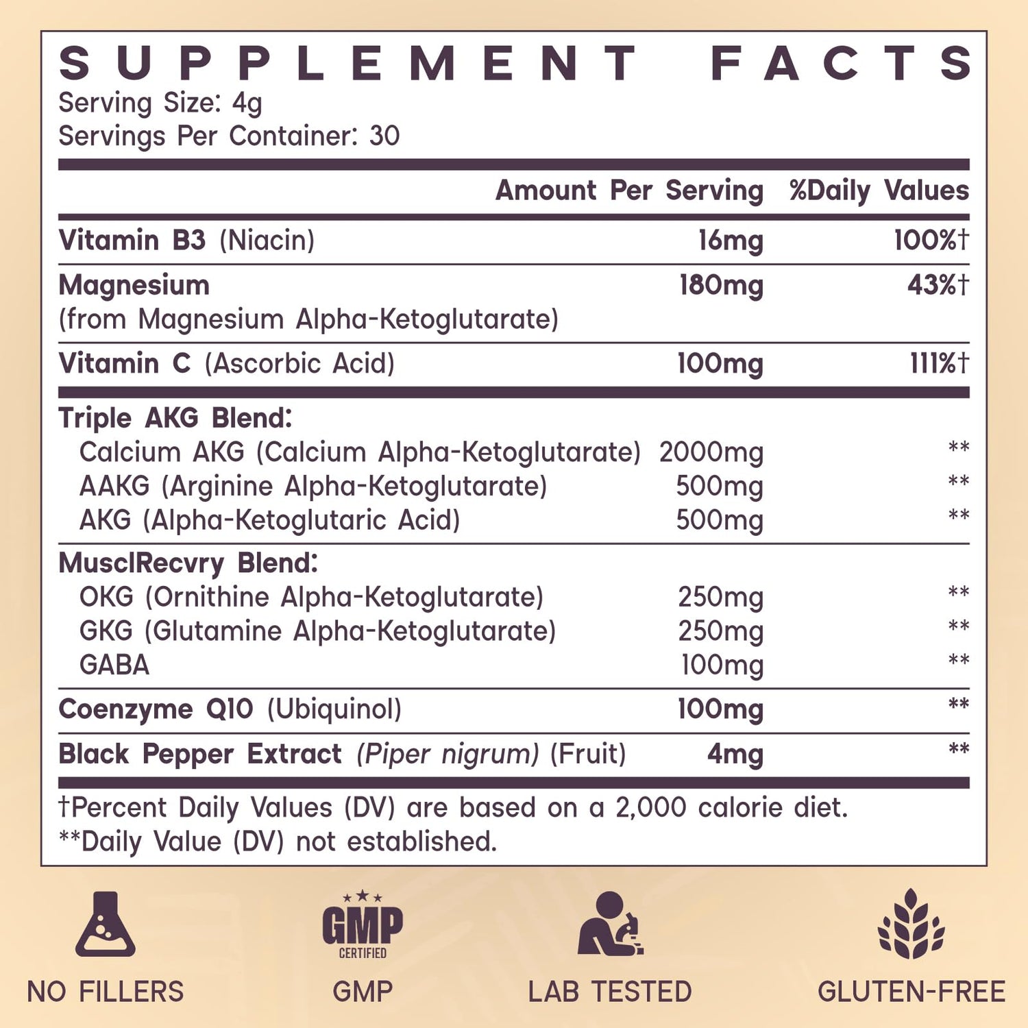 - Age Defense & Performance: AKG levels decline with age, reducing energy and endurance. AKG is almost impossible to obtain from food, making supplements the only reliable source. Calcium AKG supports longevity, AAKG enhances circulation, and AKG fuels metabolism