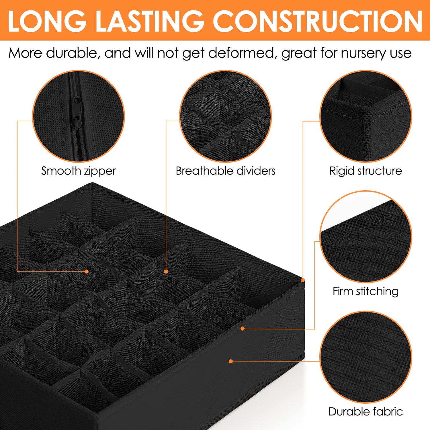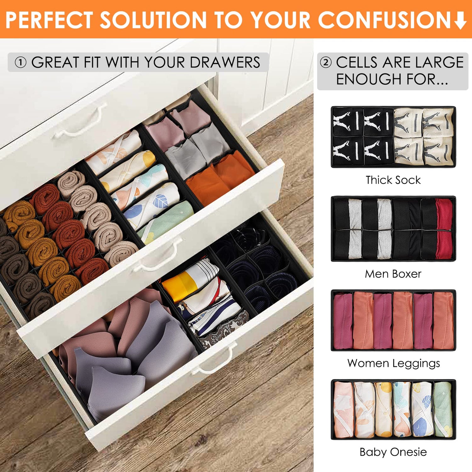- 【FIT ALL DRAWERS】Measuring 4" high, these dresser drawer organizers will perfectly fit with most of dresser drawers, sock underwear drawer. Totally 12 organizer bins, 2pcs 6-cell as shirt or bra organizer (up to C cup), 2pcs 24-cell as sock organizer, 4pcs 8-cell as tie underwear organizer, 4pcs 6-cell as scarf, belt, baby clothes drawer organizer.