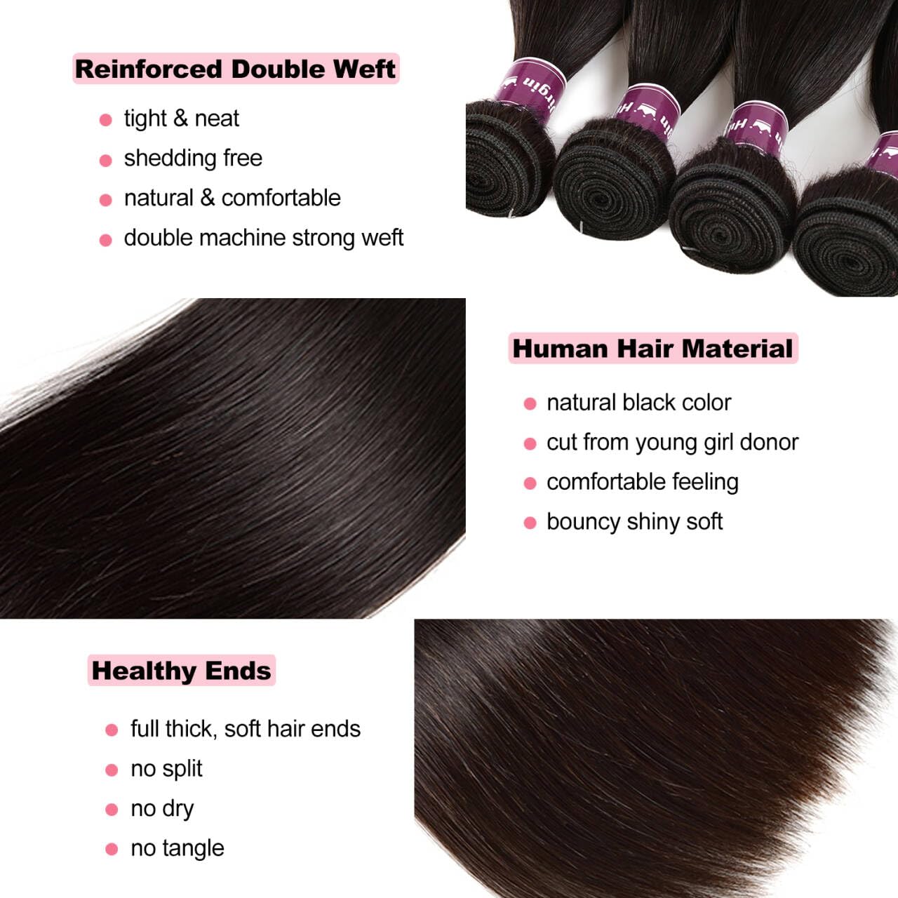 - 【Hair Material】 12A Brazilian straight hair bundles with closure human hair, cut from young girls, clean and healthy, bouncy and shiny, healthy ends 100% unprocessed human hair Brazilian virgin straight hair.