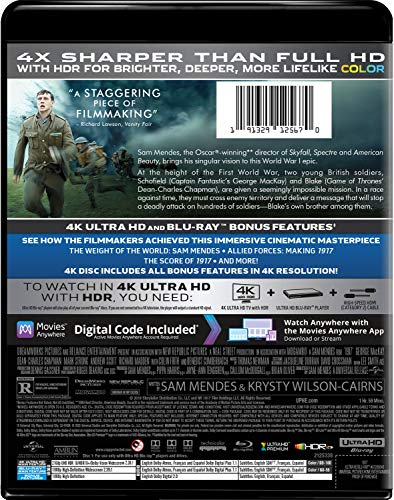 Includes 4K UHD, Blu-ray and a digital copy of 1917 (Subject to expiration. Go to NBCUCodes.com for details.) Features Dolby Vision and HDR10+ for Brighter, Deeper, More Lifelike Color The Weight of the World: Sam Mendes Allied Forces: Making 1917 The Score of 1917 In the Trenches Recreating History Feature Commentary with Director/Co-Writer Sam Mendes Feature Commentary with Director of Photography Roger Deakins ]]>.