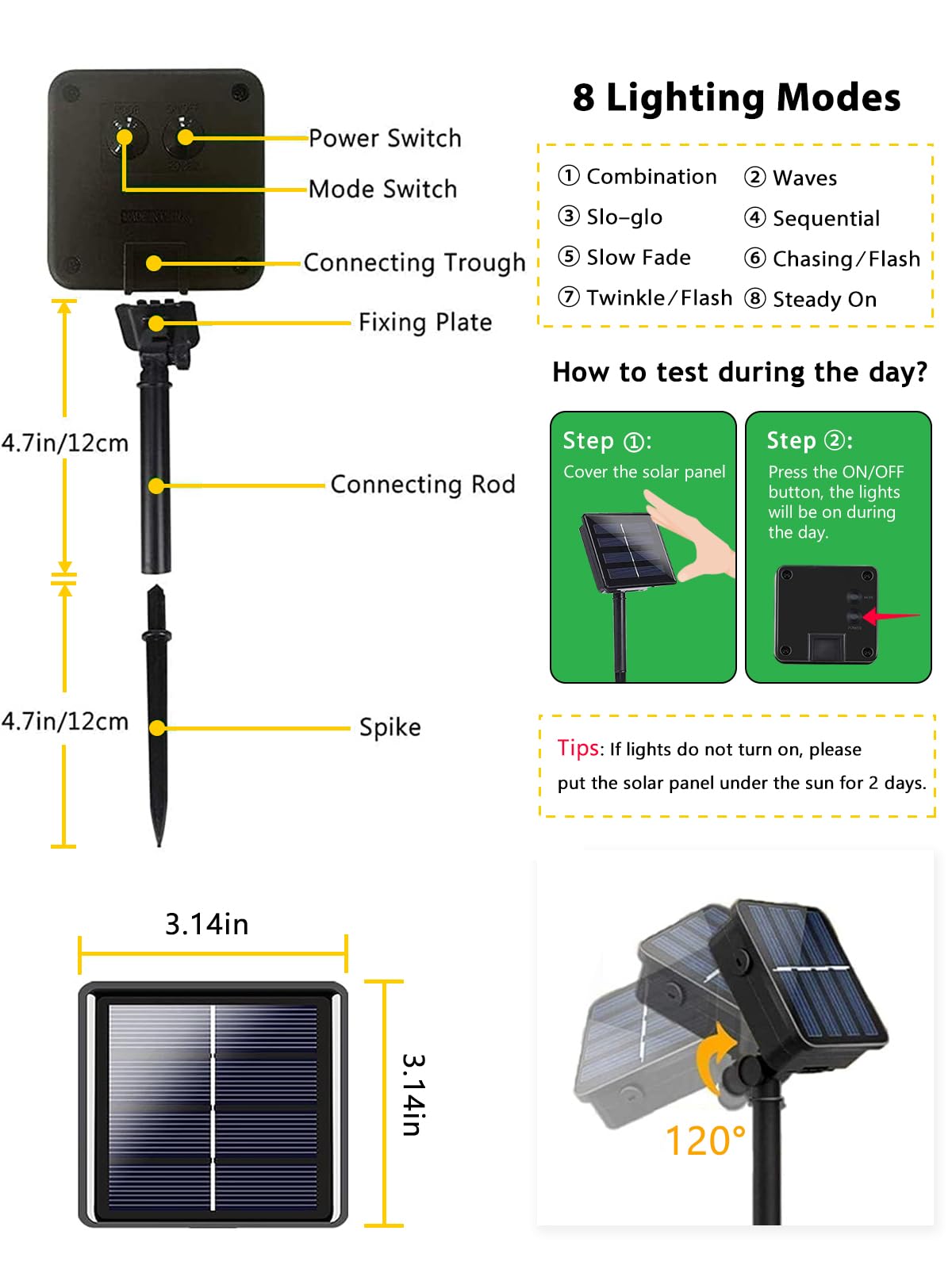 - 2025 New Upgraded Solar Christmas Lights: These solar string lights feature super-bright enhanced LED bulbs and offer 8 versatile lighting modes, a memory function, and auto on/off for effortless operation. With a larger solar panel, they achieve a higher energy conversion rate, while the larger capacity battery ensures extended illumination. Perfect for adding a festive touch, these twinkling lights on a green wire are ideal for decorating your home, yard, or outdoor spaces