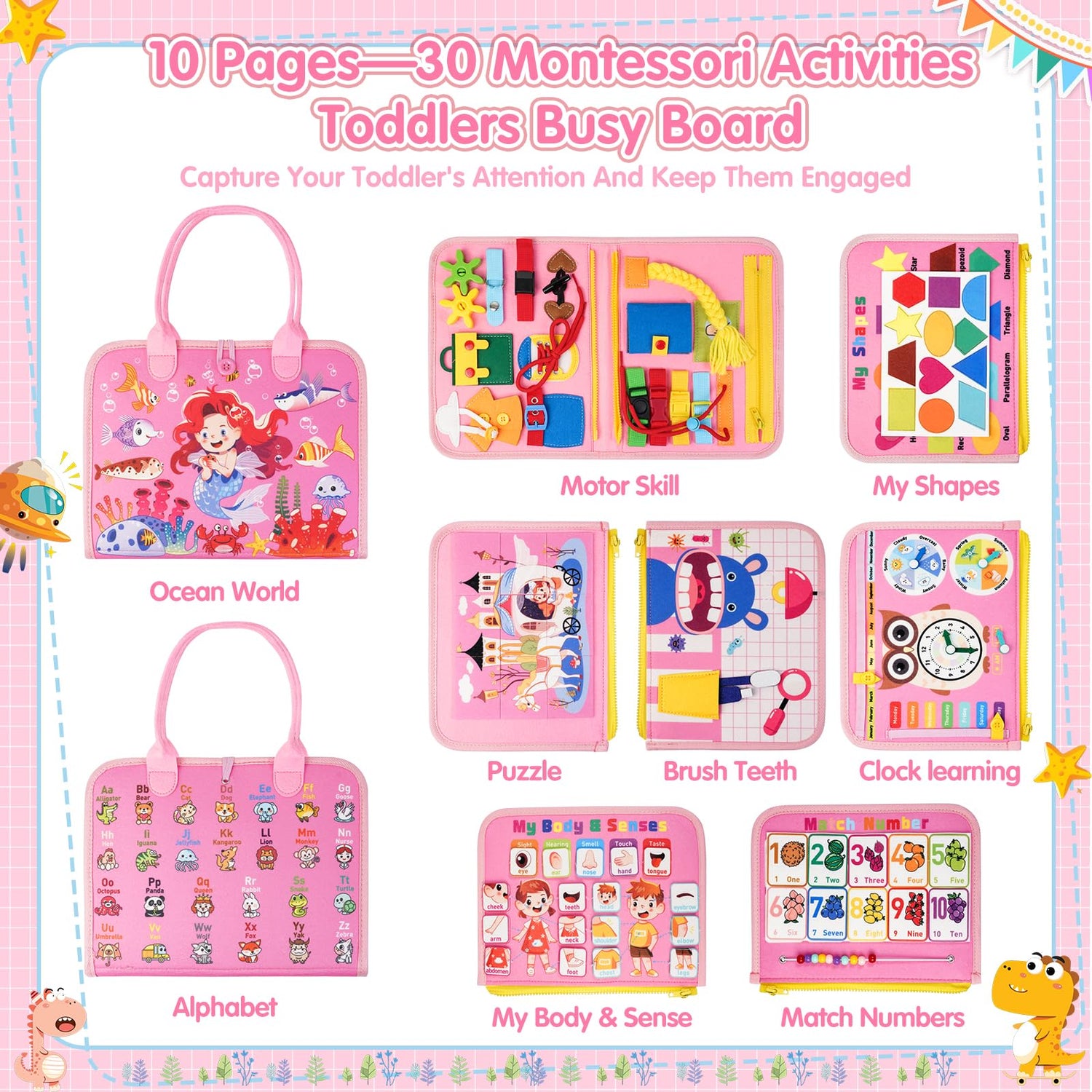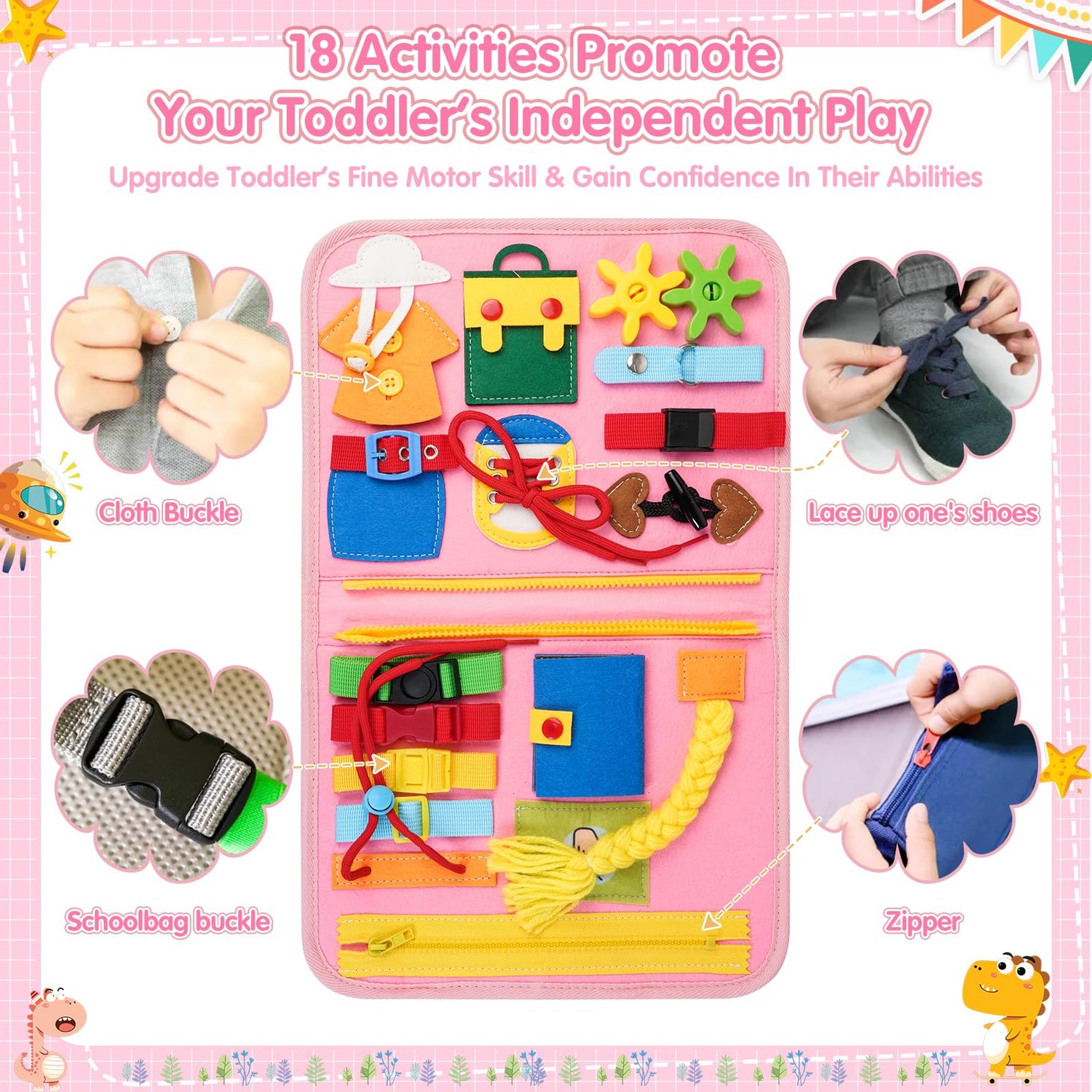 - 【Educational Toys for Toddler】This upgraded and patented designed sensory toy offers about 18 basic life skills learning activities, like zippers, shoelaces, buttons, and buckles to knobs, switches, and latches, and 12 preschool learning activities, including alphabets & phonics, shapes, numbers, body parts, senses, jigsaw puzzle games, brushing games, clocks, weather, week, season, and month games. Each activity on the busy book is carefully crafted to captivate little ones and keep their hands and minds busy.