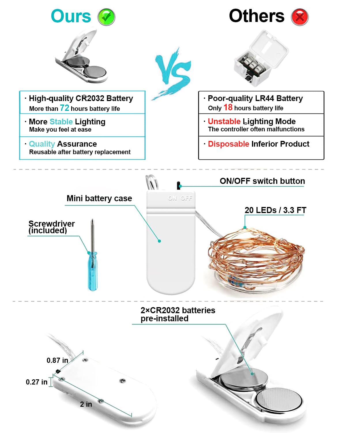 - Wide and Diverse Applicated Scenarios: Our LED fairy lights by battery operated can be used indoor and outdoor since the string lights are waterproof (Note: the battery case is not waterproof). The portable mini lights can be taken to anywhere you want to decorate. Moreover, our battery case is extremely mini in size(2*0.87 in), which makes it super easy to hide anywhere.