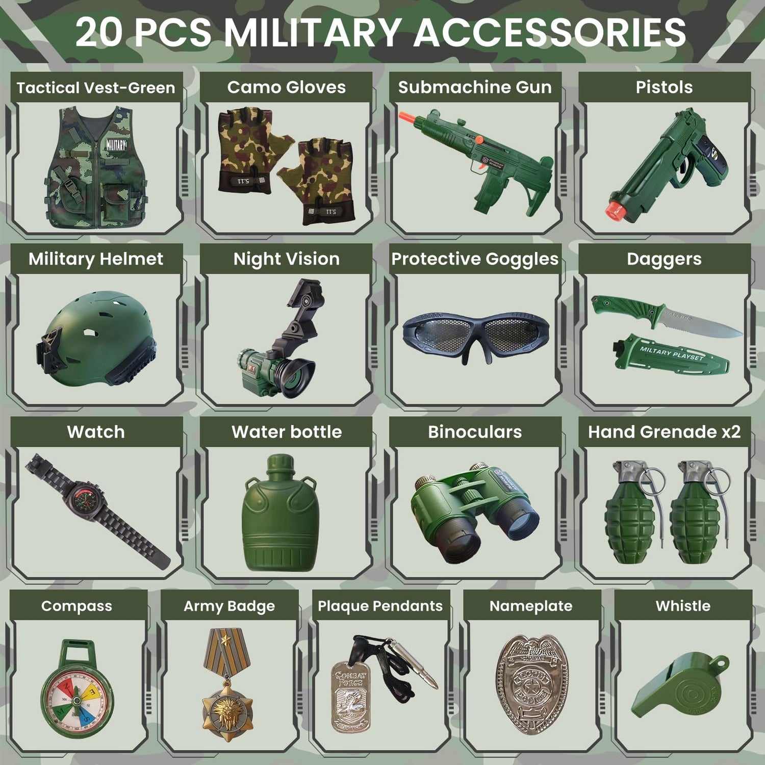 20 Piece Army Costume for Kids, Soldier Military Dress up for Boys 3-10, Kids Army Gear Role Play, Halloween Costume Camouflage Set with Vest, Camo Gloves, Helmet, Halloween Christmas Gift for Kids