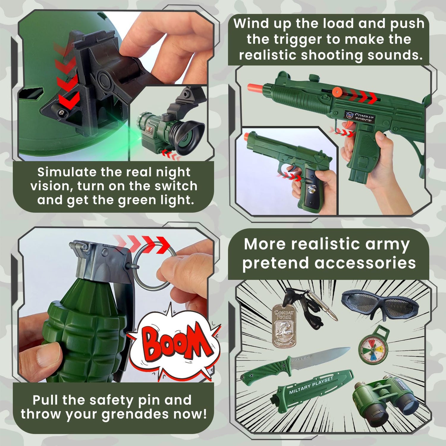 - Deluxe Kids Army Costume Set:ZIRSENG army role play set includes tactical vest (green), camo gloves, submachine gun, pistols, military helmet, night vision, protective goggles, dagger, watch, water bottle, binoculars, compass, 2 hand grenades, army badge, plaque pendants, nameplate, whistle. Every accessories your little one will need and be entertained for hours fun!