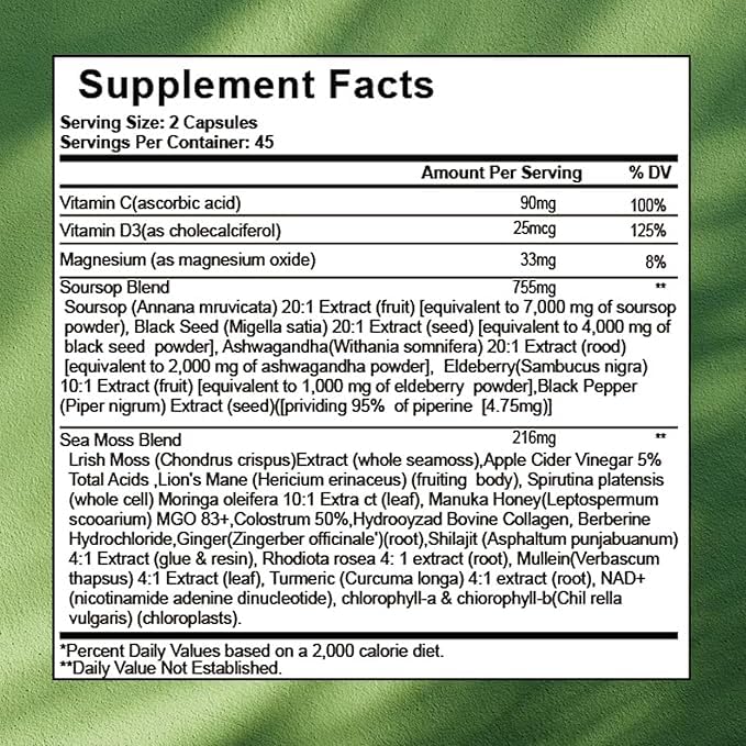 - 【Powerful 24-in-1 Natural Formula】Each capsule delivers a potent blend of 24 premium ingredients including Sour Sop, Sea Moss, Lions Mane, Ashwagandha,Turmeric, Black seed Oil, Moringa, Apple CiderVinegar,Manuka Honey, Colostrum, Chlorophyll,Spirulina, Magnesium, Ginger, Berberine, Rhodiola Rosea,Mullein, and more to support immunity, digestion, and health.