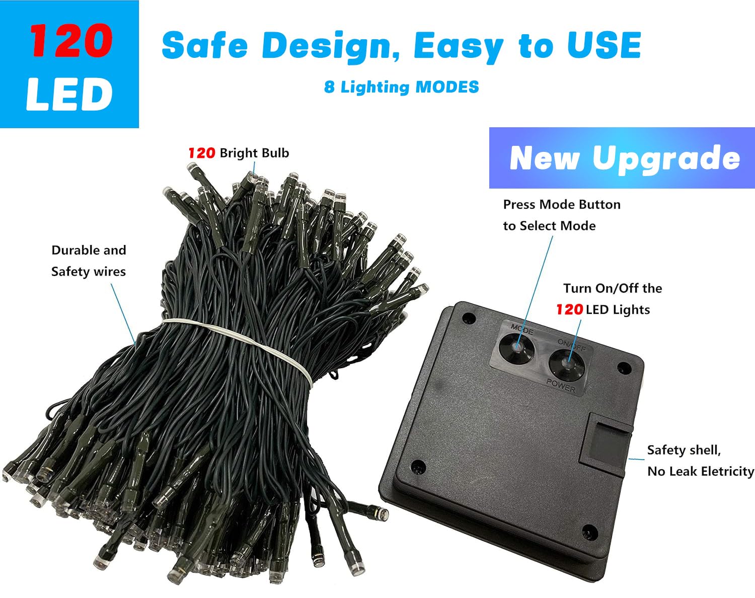 - [Solar Lights Outdoor]:Upgraded each pack of solar christmas Lights is 47.5 feet, the lead wire is 6.6 feet, and the bulb spacing is 0.34 inches. Based on the old 100LED, our Christmas decorations lights have added 20LED and lead length, which makes us more free to arrange the scene.