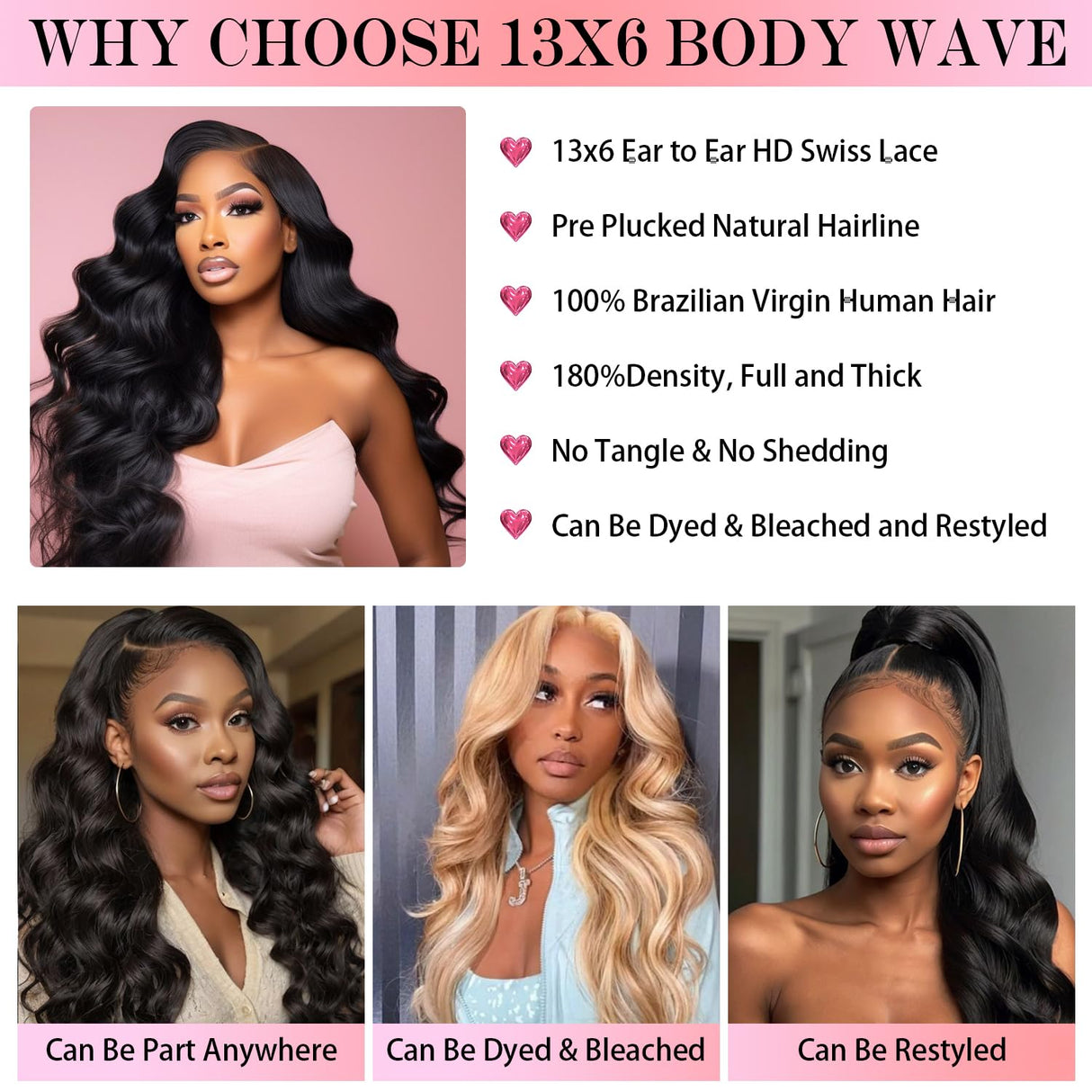- Body Wave Lace Front Wigs Human Hair Quality: The 13X6 HD Lace Front Wigs Human Hair for Women Made with Brazilian Virgin Human Hair, Cut from Young Healthy Ladies,Soft and bouncy,No Shedding, No Tangle, True to Length. 180% Density Frontal Human Hair Wigs,Full and Thick